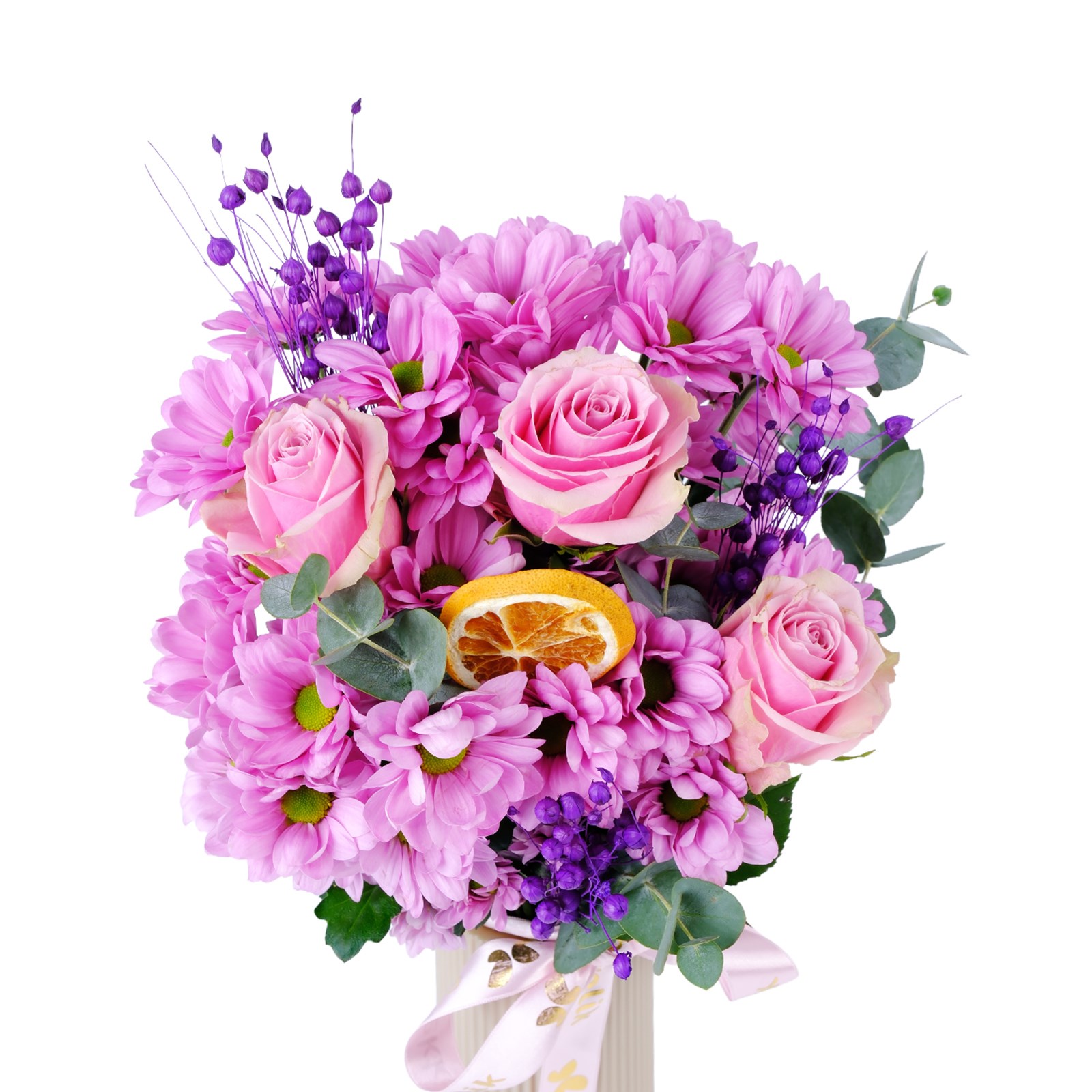Çiçek türleri:Pembe papatyalar, okaliptus yaprakları ve pembe güller