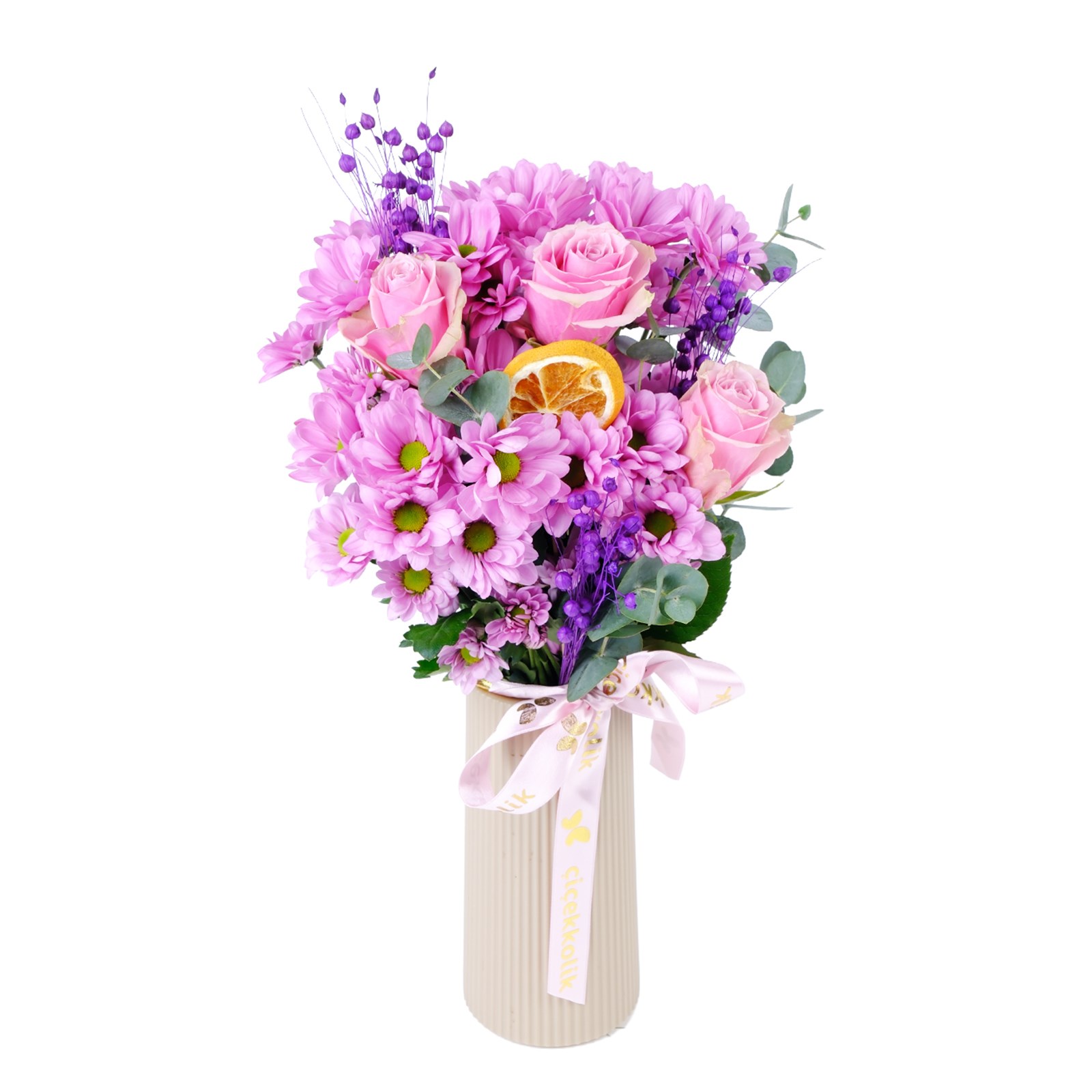 Güneşin sıcaklaığını ve enerjisini evinize taşıyan Pink Gül & Papatyalar, canlı pembe gül ve pembe papatyalarıyla neşe ve mutluluk yayar.Kuru çiçekler ve okaliptus dalları bu eşsiz tasarıma doğal bir sıcaklık katarken , zarif krem polimer vazo ise modern bir şıklık sunar.