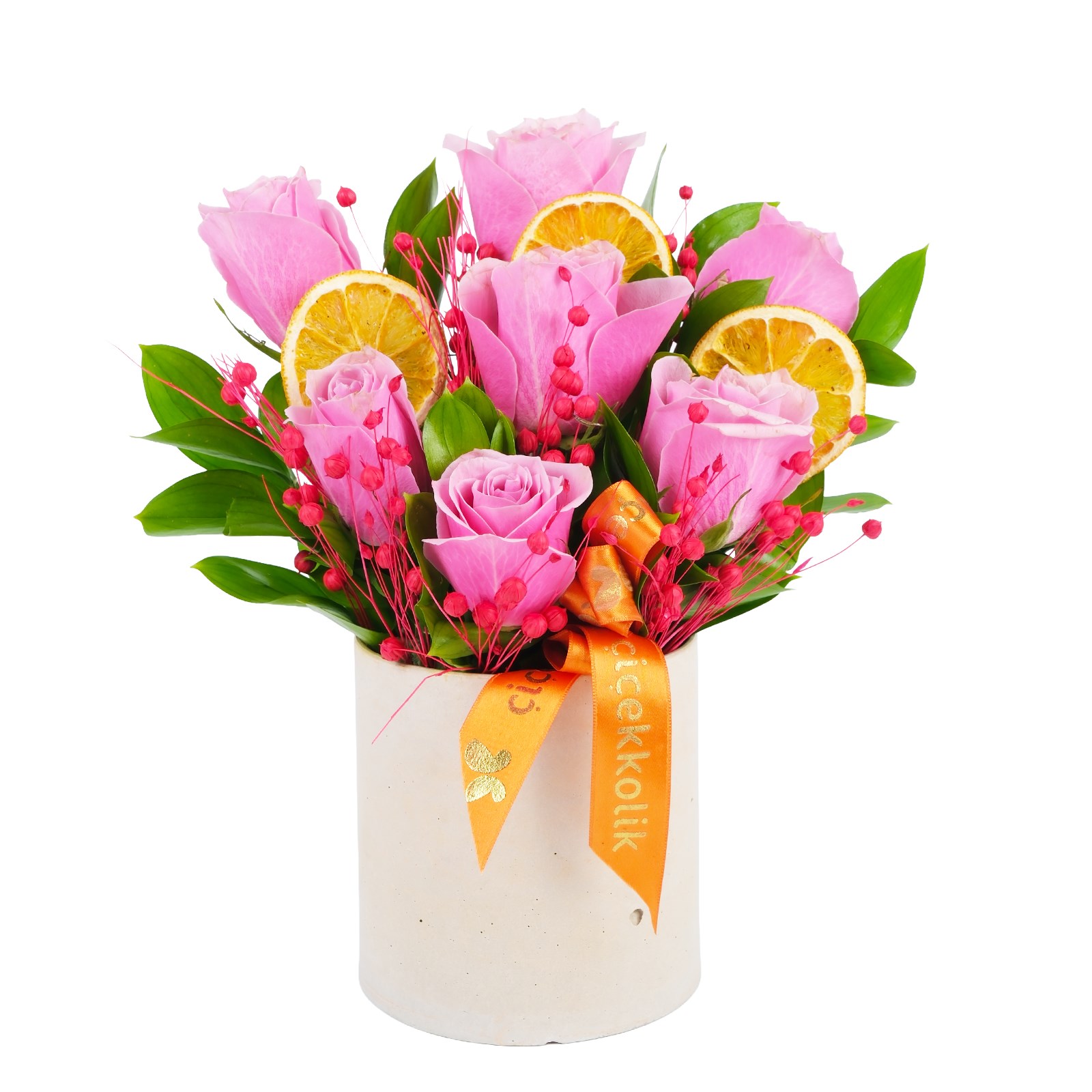 Pembe güllerin sıcak enerjisi, bu zengin aranjmanda kışın en doğal detaylarıyla bir araya geliyor. Canlı pembe güllerin dolgun duruşu; kurutulmuş portakal dilimleri, kırmızı luna dalları, tropik bitkilerle birleşerek hem görsel hem de aromatik şölen sunuyor. Beton vazosuyla bu tasarım, her mekana modern ve samimi bir hava katar.