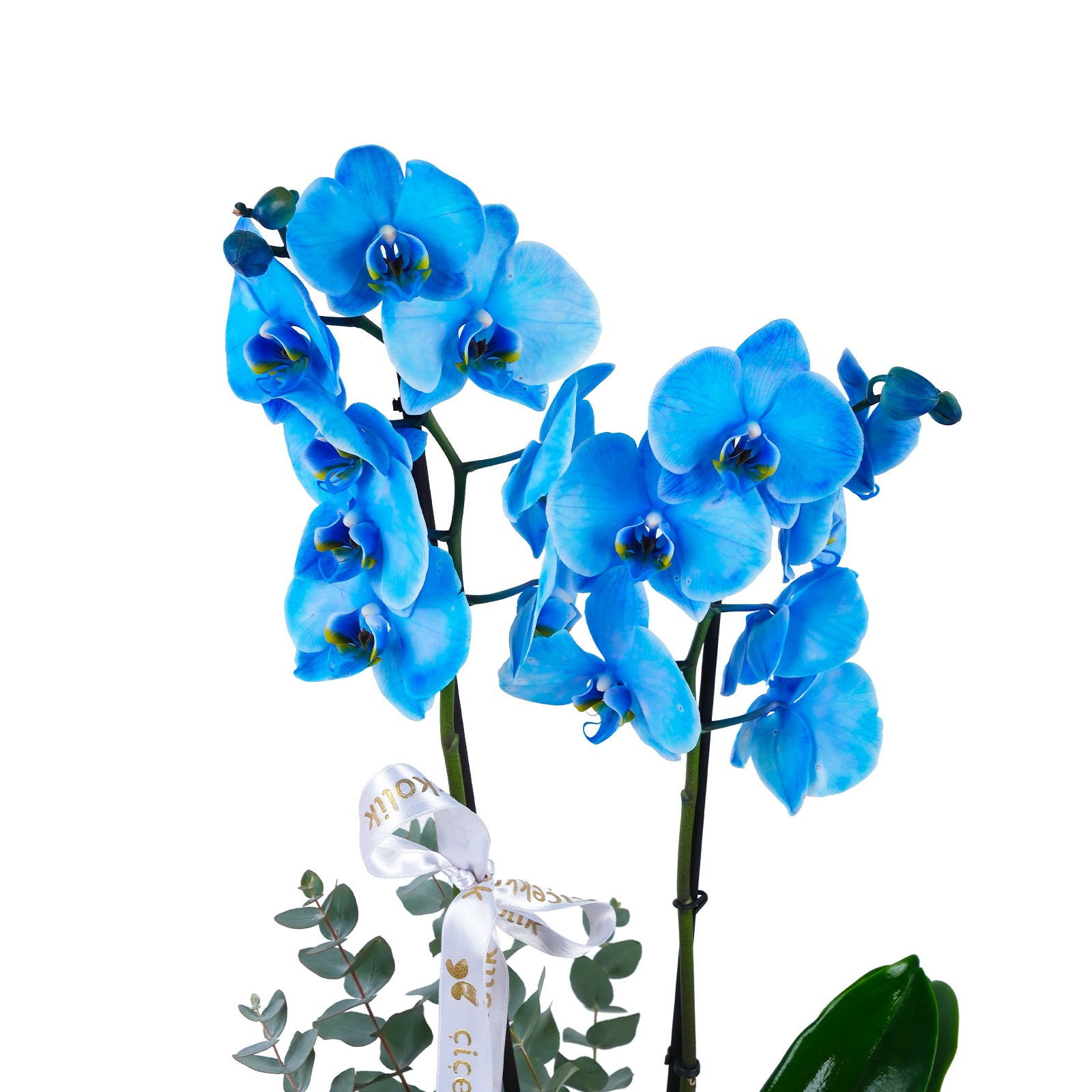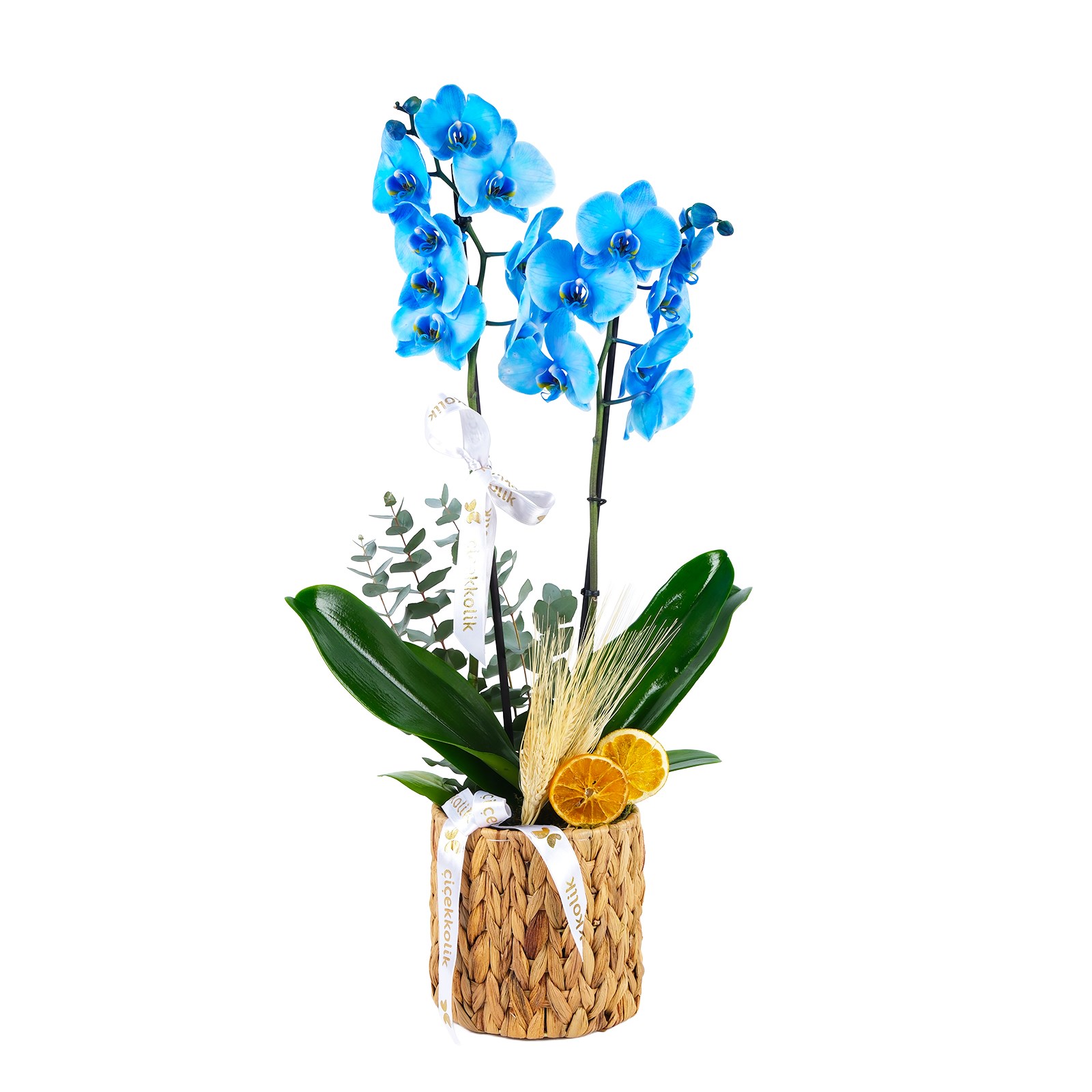 Saflığın ve zarafetin sembolü mavi orkide, doğal örgü sepet içerisinde yeşil yapraklar, okaliptus dalları ve yeşil yosunlar ile zenginleştirilerek hazırlanmıştır. Hem ev hem ofis ortamına şıklık katan bu özel aranjman, sevdiklerinize kalıcı bir mutluluk armağan eder.
