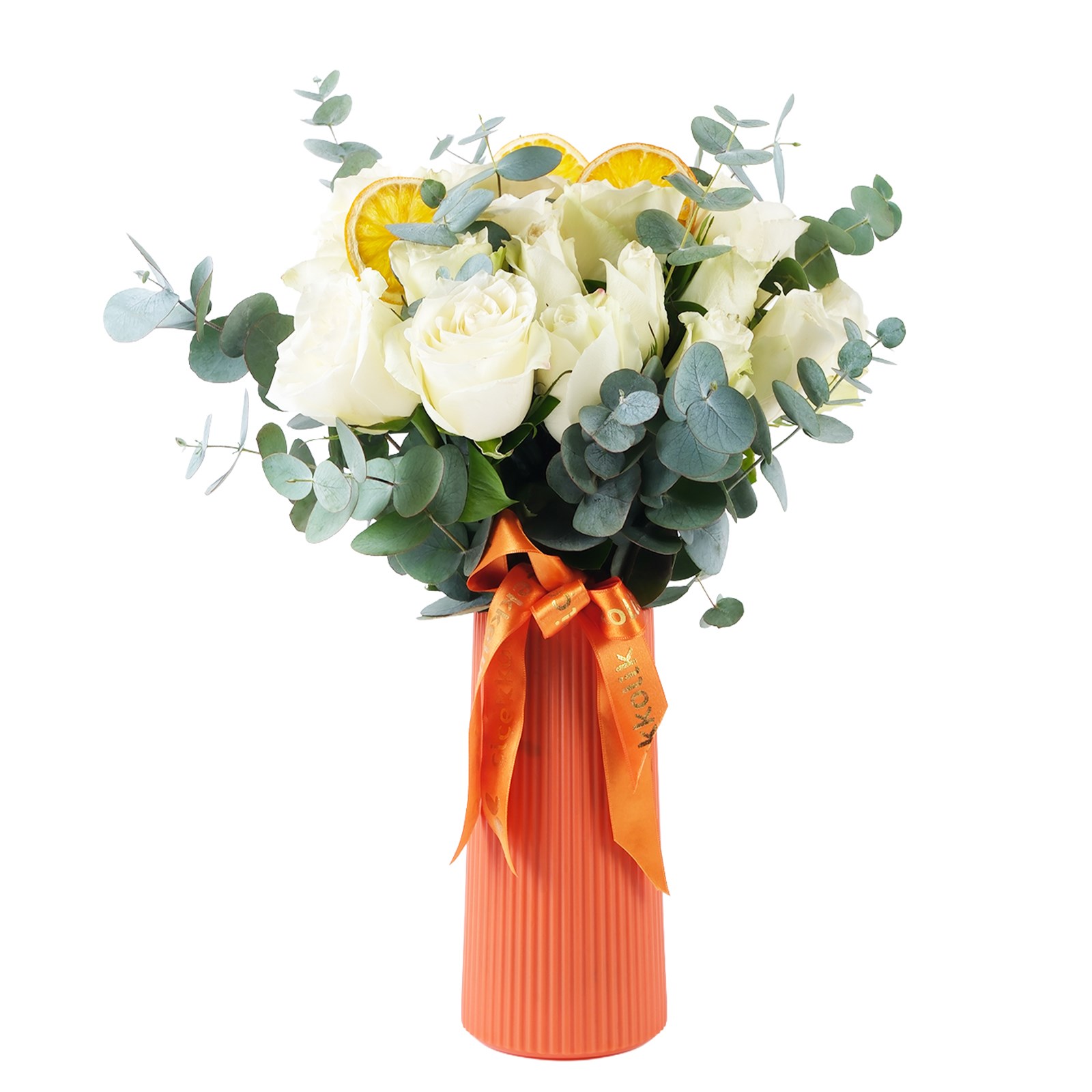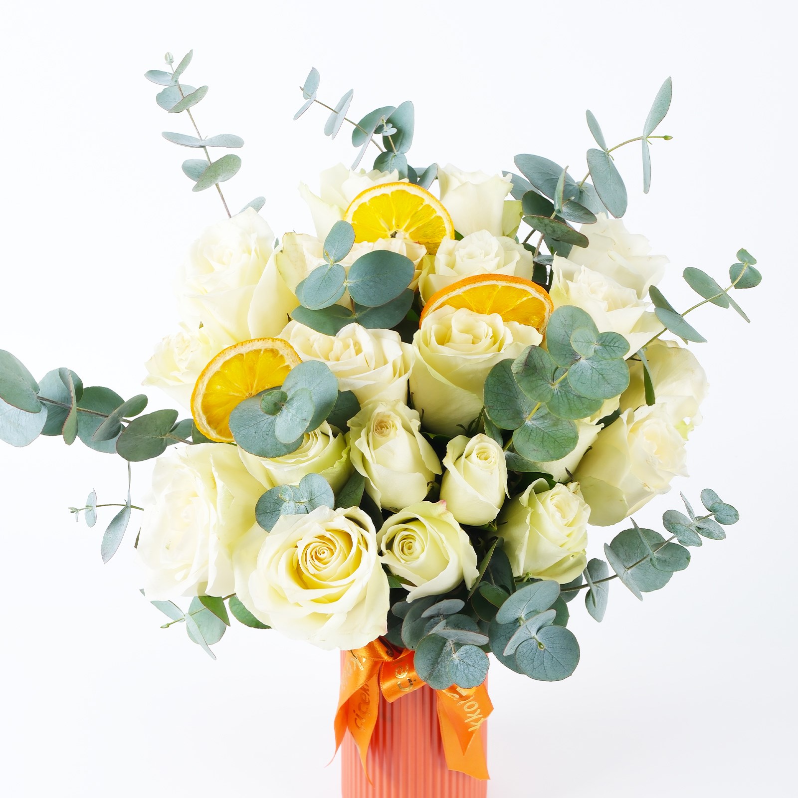 Beyaz güllerin romantizmi Pure Classicbomb, aşkın en tutkulu halini yansıtıyor. Modern tasarım sofistike kontrastı, çarpıcı bir görsel sunarken okalptus yaprakları ile eşsiz bir dokunuş kazanılmıştır.