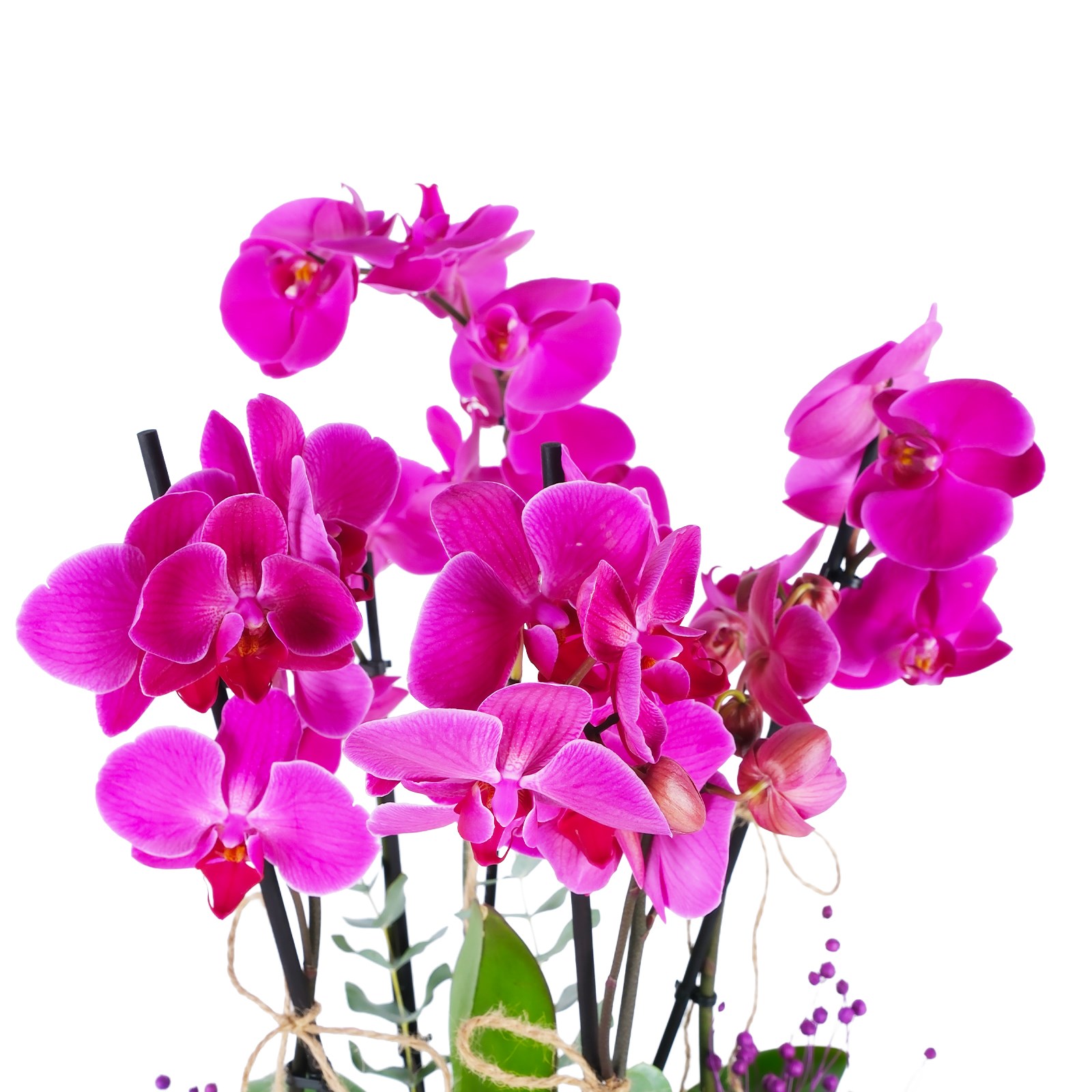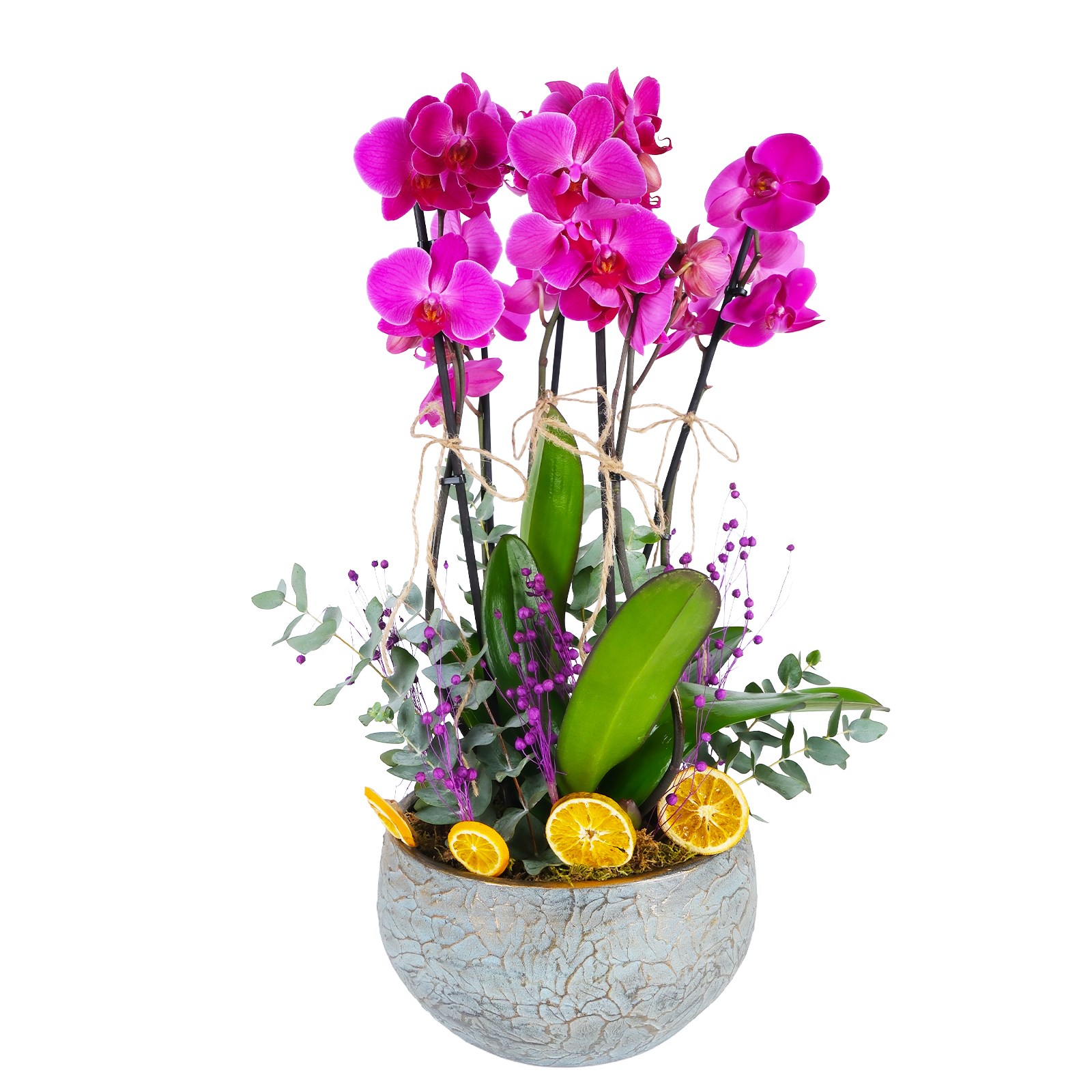 Saflığın ve zarafetin sembolü mor orkide, doğal dekoratif saksı içerisinde yeşil yapraklar, okaliptus dalları ve yeşil yosunlar ile zenginleştirilerek hazırlanmıştır. Hem ev hem ofis ortamına şıklık katan bu özel aranjman, sevdiklerinize kalıcı bir mutluluk armağan eder.