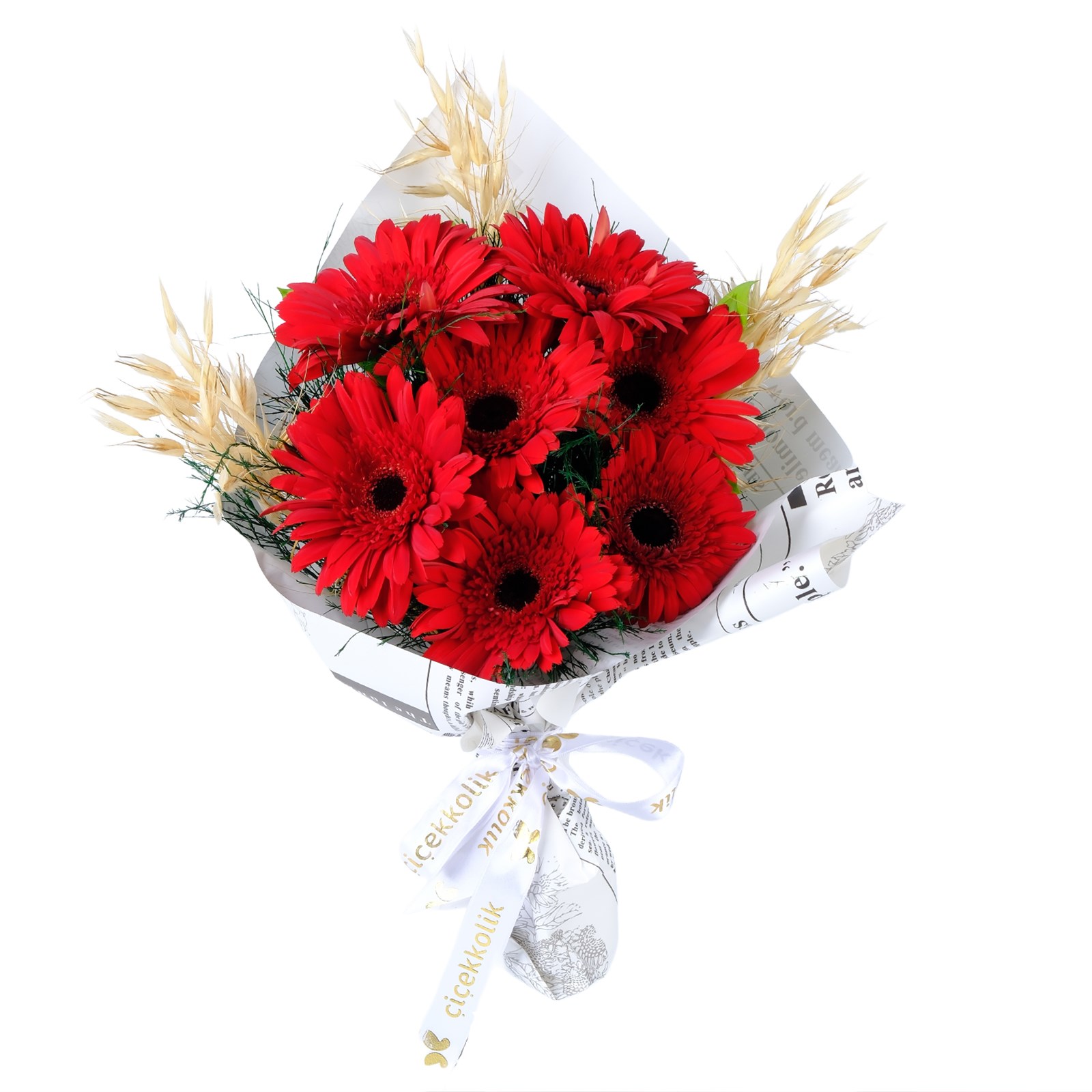 Kırmızı gerberaların saçtığı pozitif enerji,gazete ambalajın doğal kokusu ve modern gazete ambalajla birleşerek sevdiklerine en samimi duygularını taşıyor.Bukete eşlik eden kuru çiçekler tasarıma hem rustik bir hava katıyor hem de doğanın renkli bir yansımasını sunuyor.