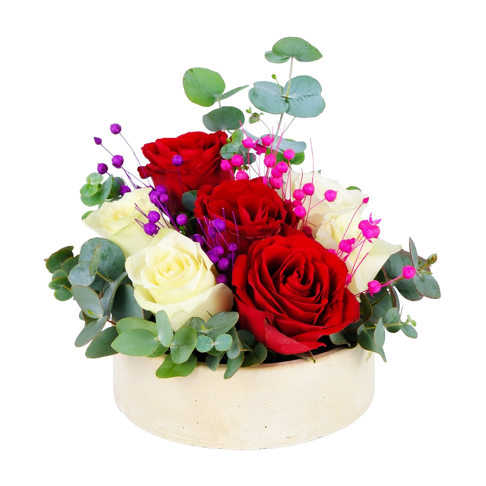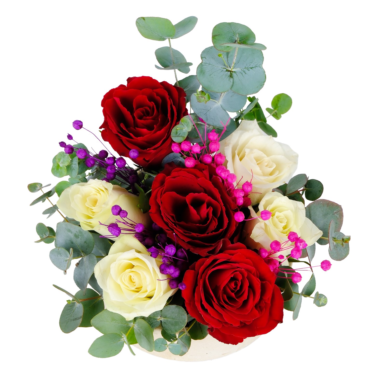 Enerjisi yüksek renklerin buluştuğu Red & White Love Güller, modern ve ferah bir görünüm sunar. Beyaz,kırmızı güller ve kuru çiçek dalları zarif bir kompozisyon oluşturur.