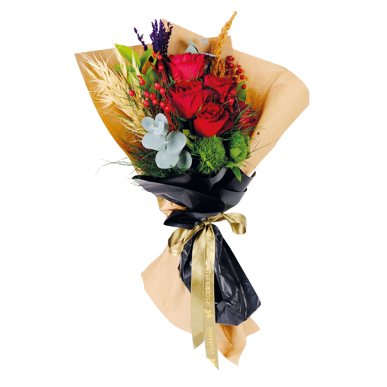 Derin kırmızı güllerin romantizmini, kuru çiçeklerin doğal zarafetini bir araya gertiren Romantic Speak 5 kırmızı gül buketi, aşkın en tutkulu halini yansıtıyor.Siyah ve Kraft tasarım ambalajın sofistike kontrastı, çarpıcı bir görsel sunarken okaliptus yaprakları ve kuru çiçekleriyle eşsiz bir dokunuş kazanılmıştır.