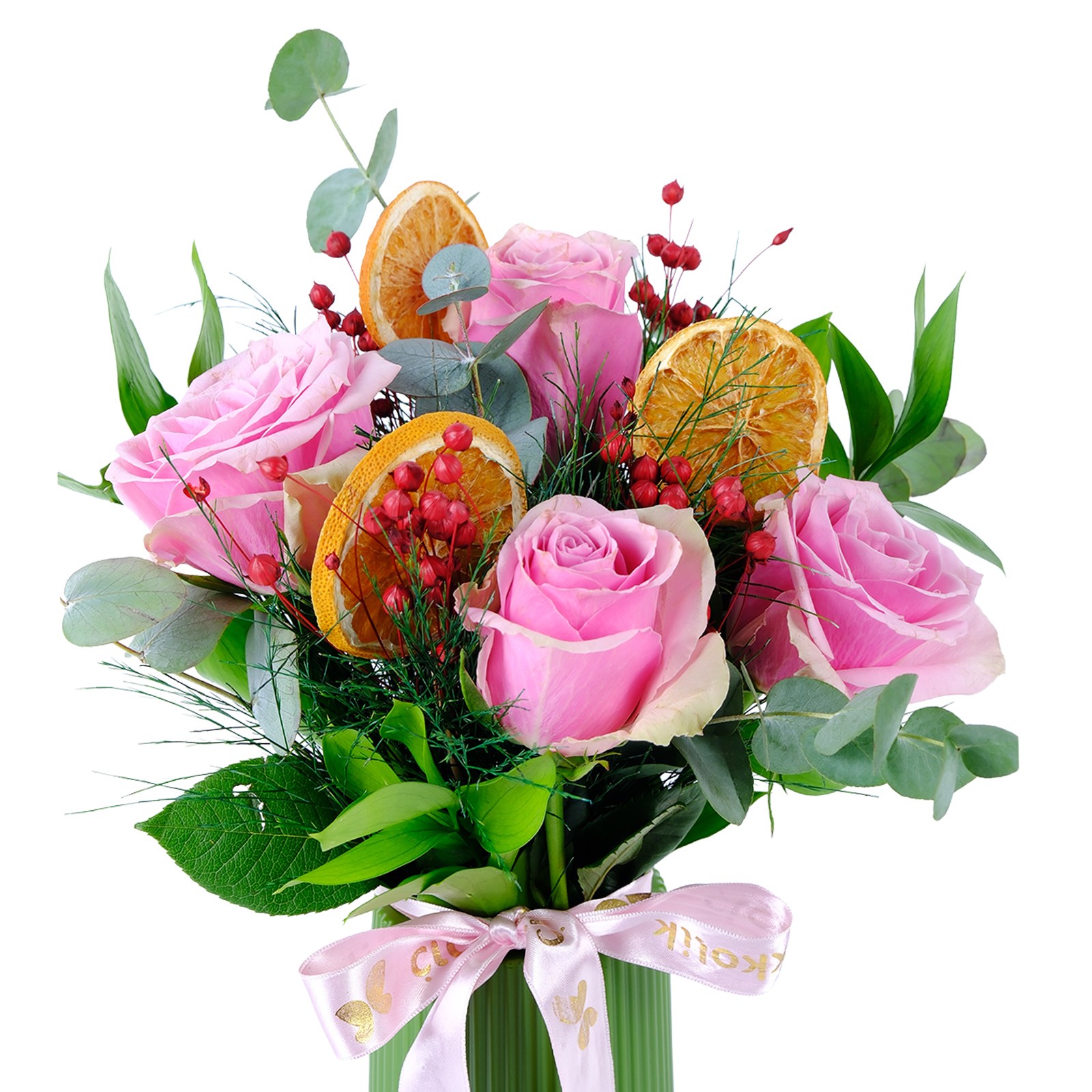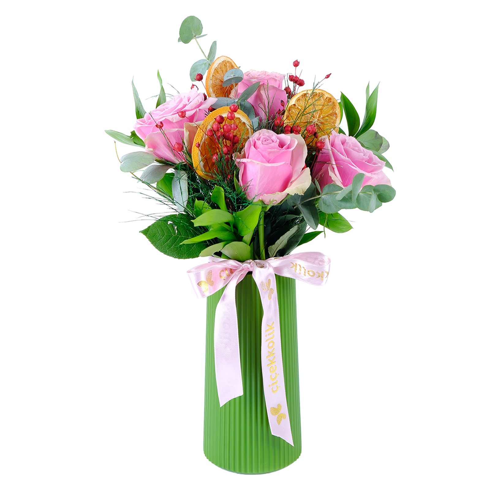 Enerjisi yüksek renklerin buluştuğu Rosy dream blossom pembe güller, modern ve ferah bir görünüm sunar. Pembe güller,okaliptus dalları ve kuru çiçek dalları zarif bir kompozisyon oluşturur.