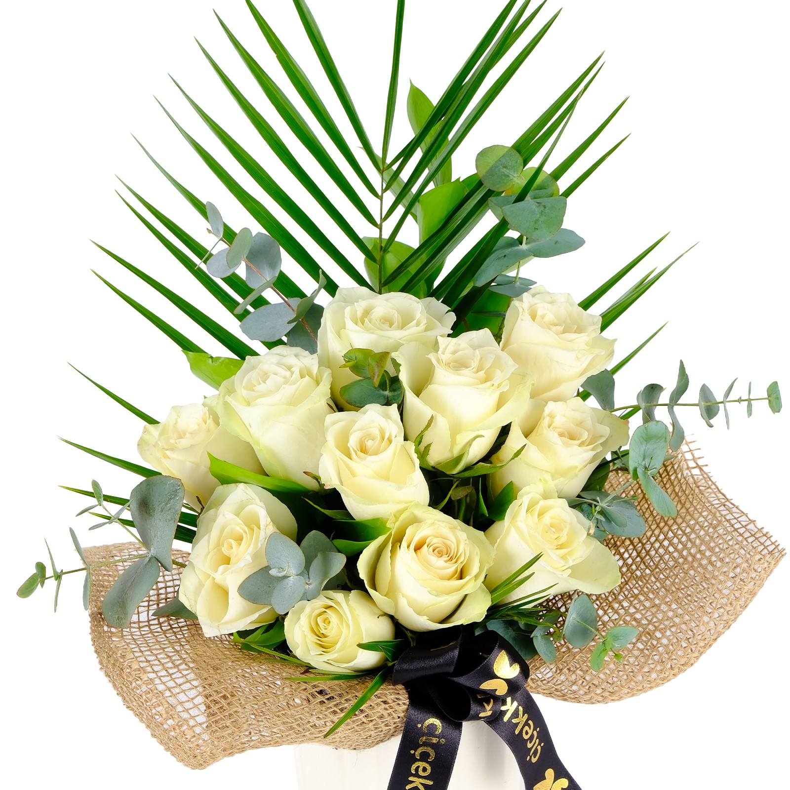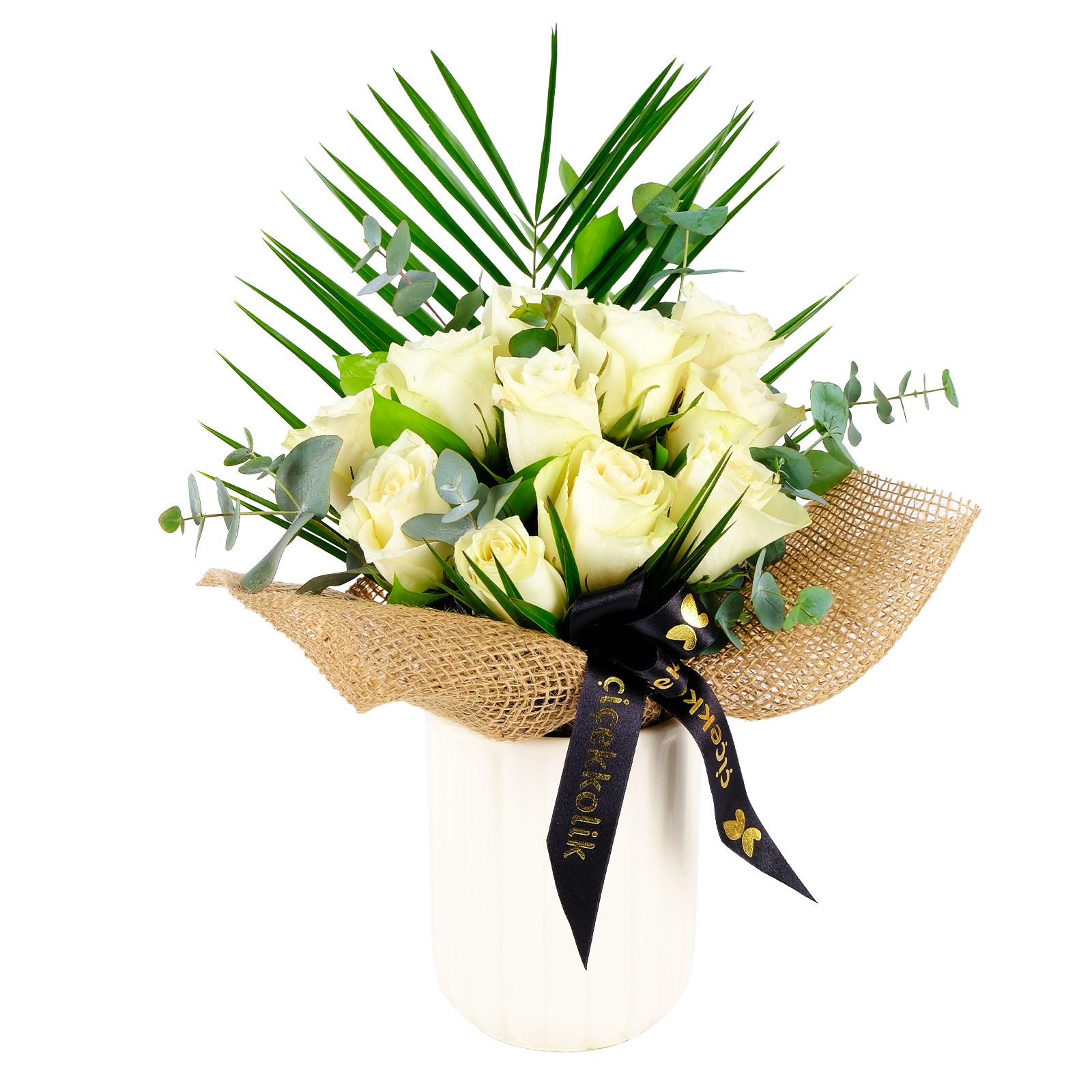 Enerjisi yüksek renklerin buluştuğu Sack Design White Roses, modern ve ferah bir görünüm sunar. Beyaz güller ve kuru çiçek dalları zarif bir kompozisyon oluşturur.