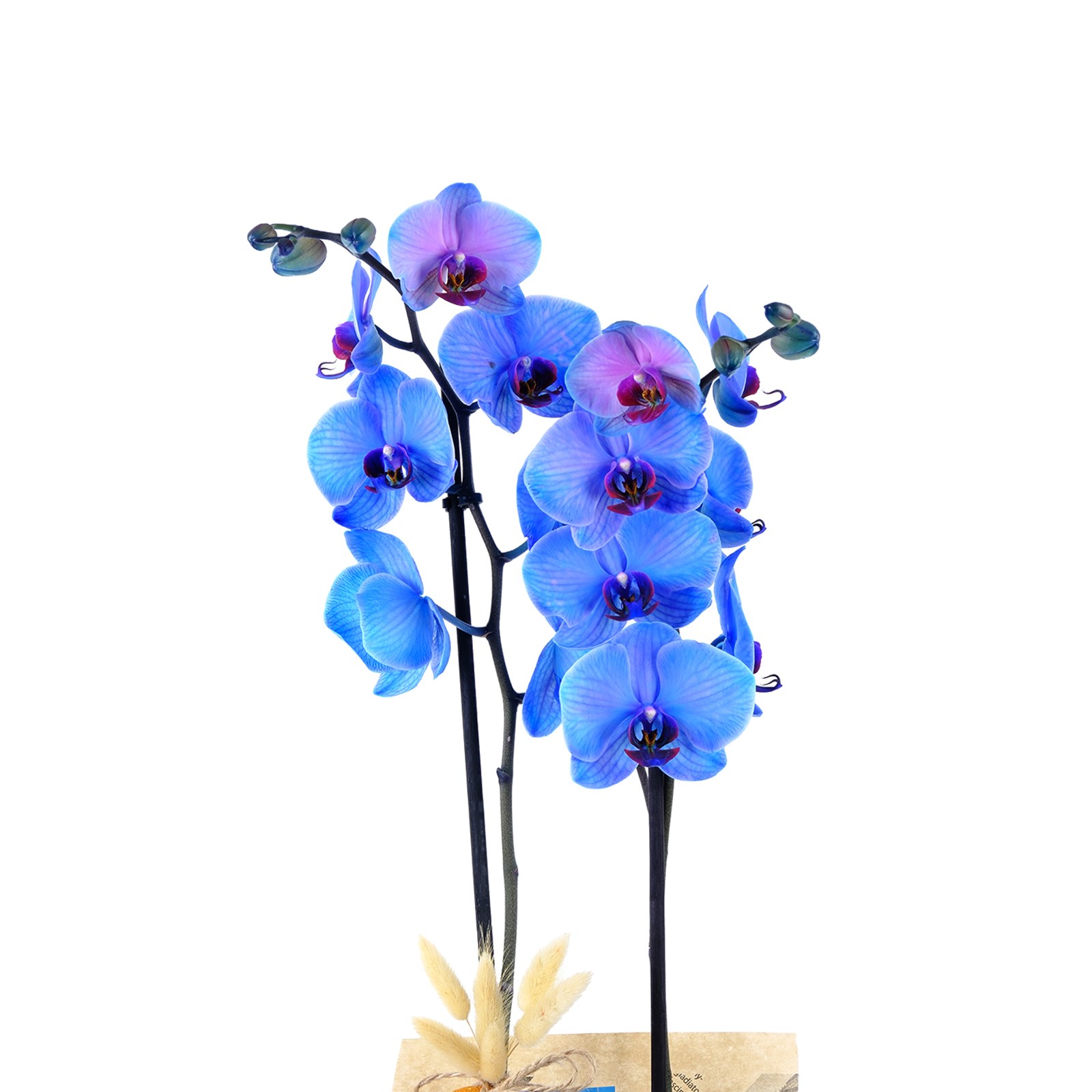 Zarif görünümü ve eşsiz rengiyle Sapphire Kiss Çiftli Mavi Orkide, yaşam alanlarına modern bir dokunuş kazandırır. Gazete tasarım ambalaj ve naturel kurdele detayıyla hem sofistike hem de dikkat çekici bir tasarım sunar.