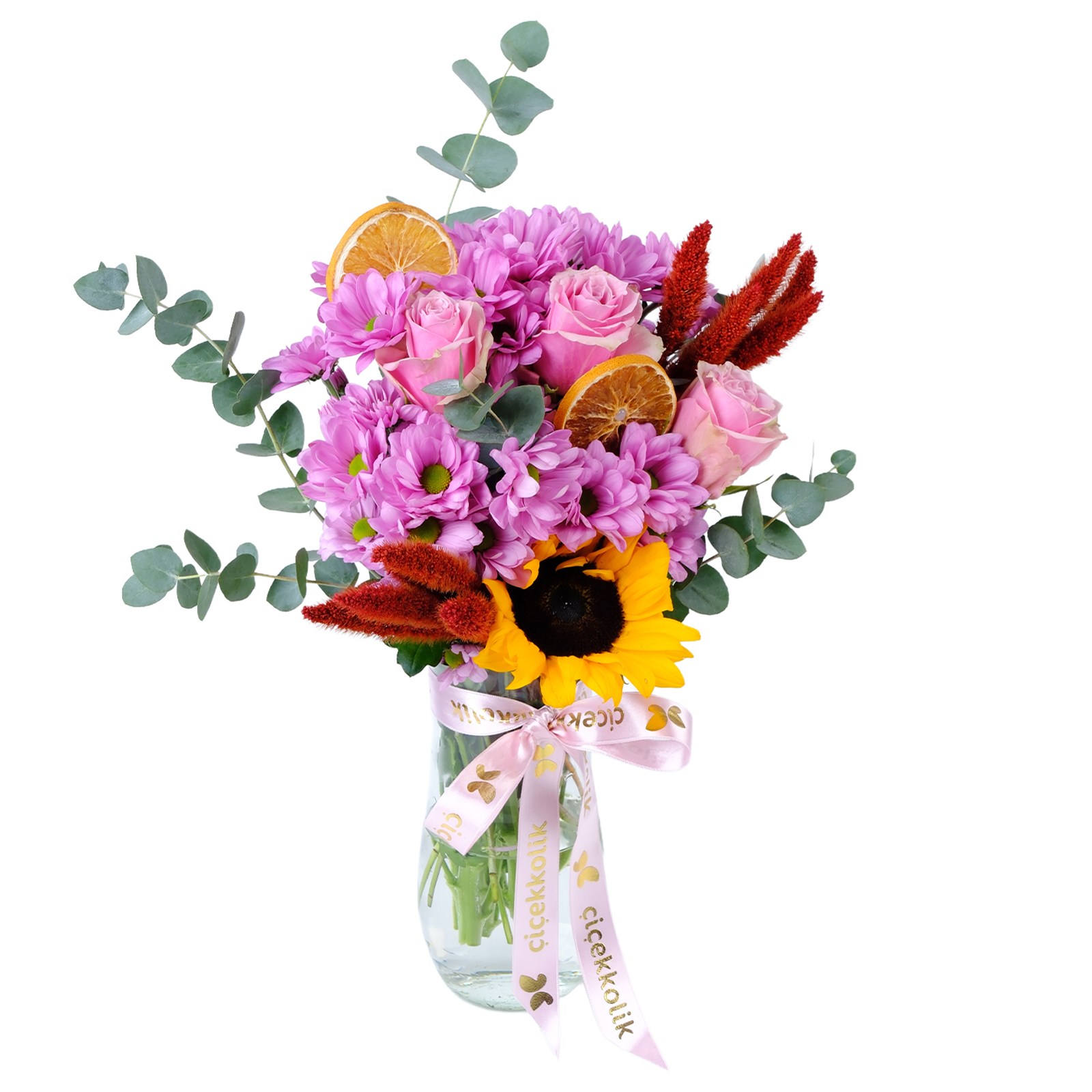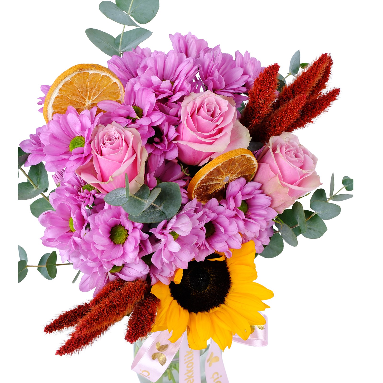 Güneşin sıcak enerjisini evine taşıyan Ayçiçeği aranjmanı, sarı ayçiçeği ve pembe güllerin eşsiz uyumunu yansıtır. Ateş kuru çiçek dalları ve okaliptüs yapraklarıyla tamamlanmış bu aranjman, iç açıcı renk tonlarıyla öne çıkar.