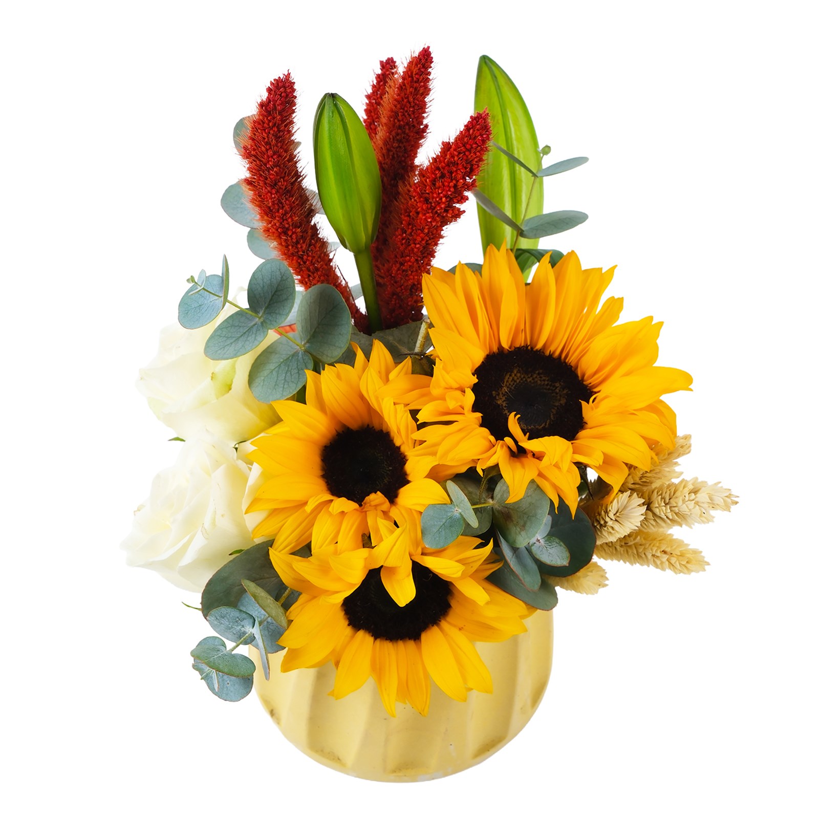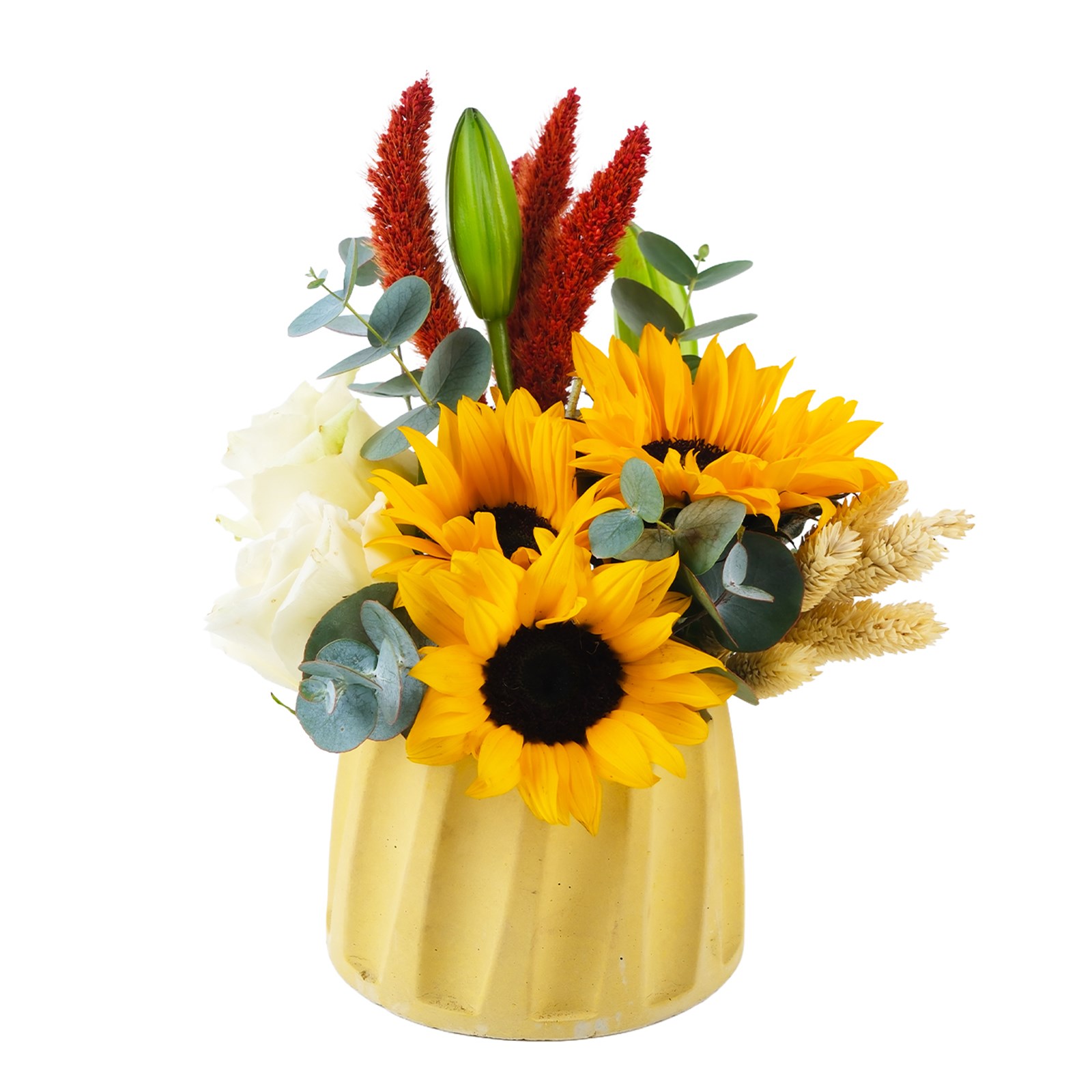 Ayçiçeklerin romantizmi Sunflower Light Ayçiçeği, aşkın en tutkulu halini yansıtıyor. Modern tasarım sofistike kontrastı, çarpıcı bir görsel sunarken beyaz güller, okaliptus yaprakları kuru çiçekleriyle eşsiz bir dokunuş kazanılmıştır.