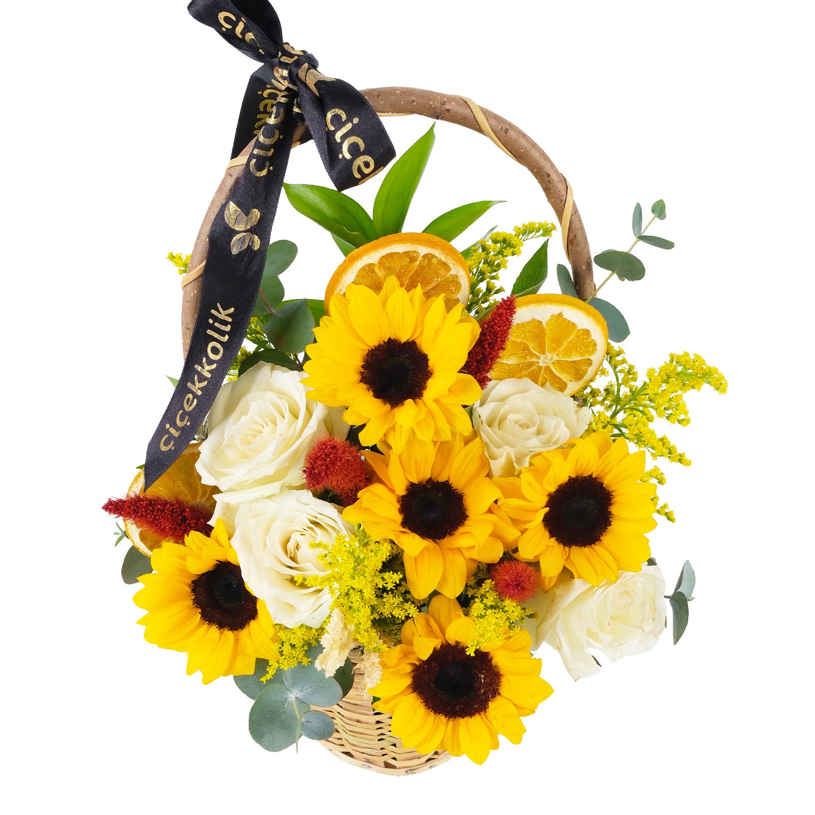 Ayçiçek ve gülün romantizmi Sunflower & White Roses Basket, aşkın en tutkulu halini yansıtıyor. Modern tasarım doğal kokulu sepet sofistike kontrastı, çarpıcı bir görsel sunarken okaliptus yaprakları kuru çiçekleriyle eşsiz bir dokunuş kazanılmıştır.