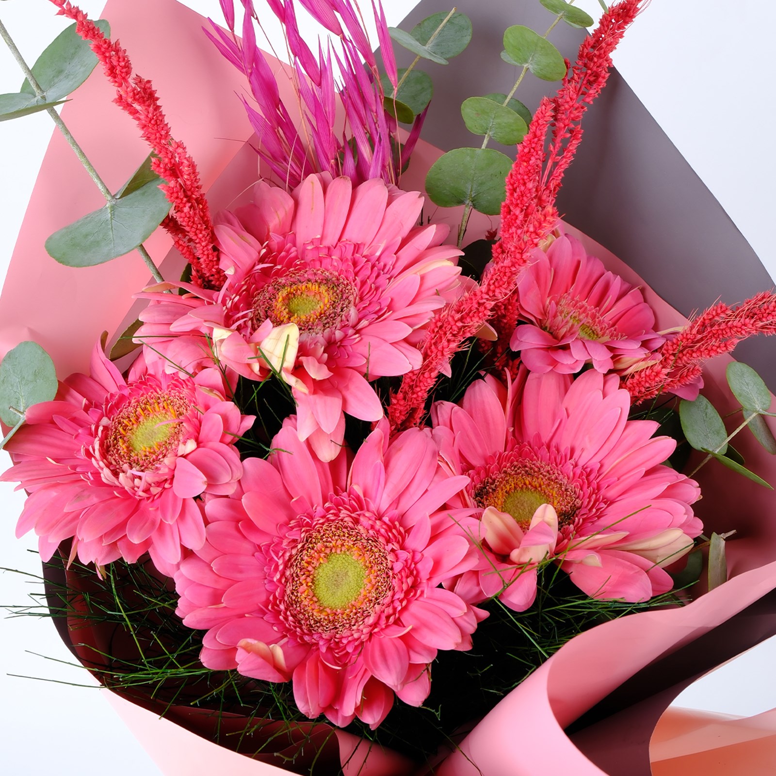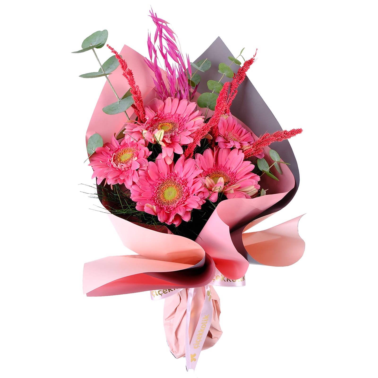 Pembe gerberaların saçtığı pozitif enerji,gazete ambalajın doğal kokusu ve modern pembe ambalajla birleşerek sevdiklerine en samimi duygularını taşıyor.Bukete eşlik eden kuru çiçekler tasarıma hem rustik bir hava katıyor hem de doğanın renkli bir yansımasını sunuyor.