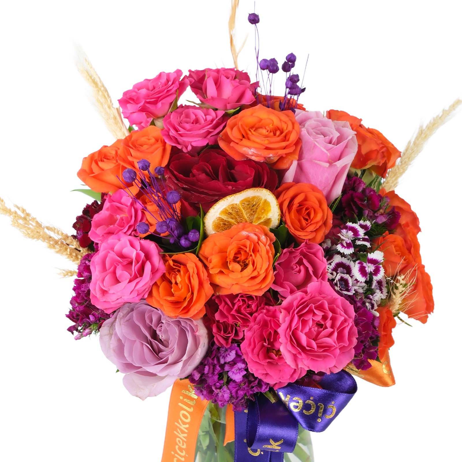 Pembe ve turuncu güllerin romantizmi Sweet & Pretty Ball Çiçek Aranjmanı, aşkın en tutkulu halini yansıtıyor. Modern tasarım sofistike kontrastı, çarpıcı bir görsel sunarken hüsnüyusuf,lila güller ve kuru çiçekleriyle eşsiz bir dokunuş kazanılmıştır.