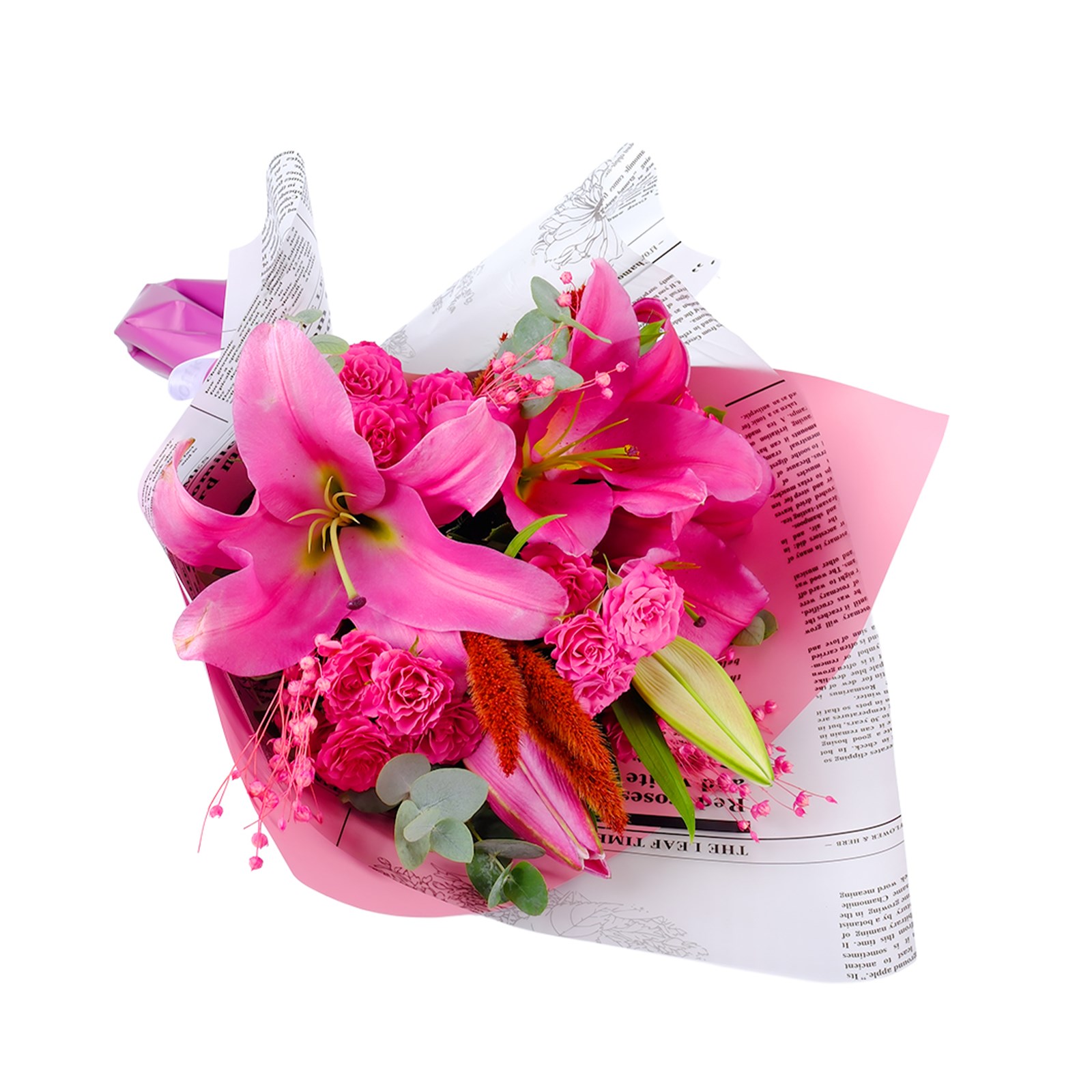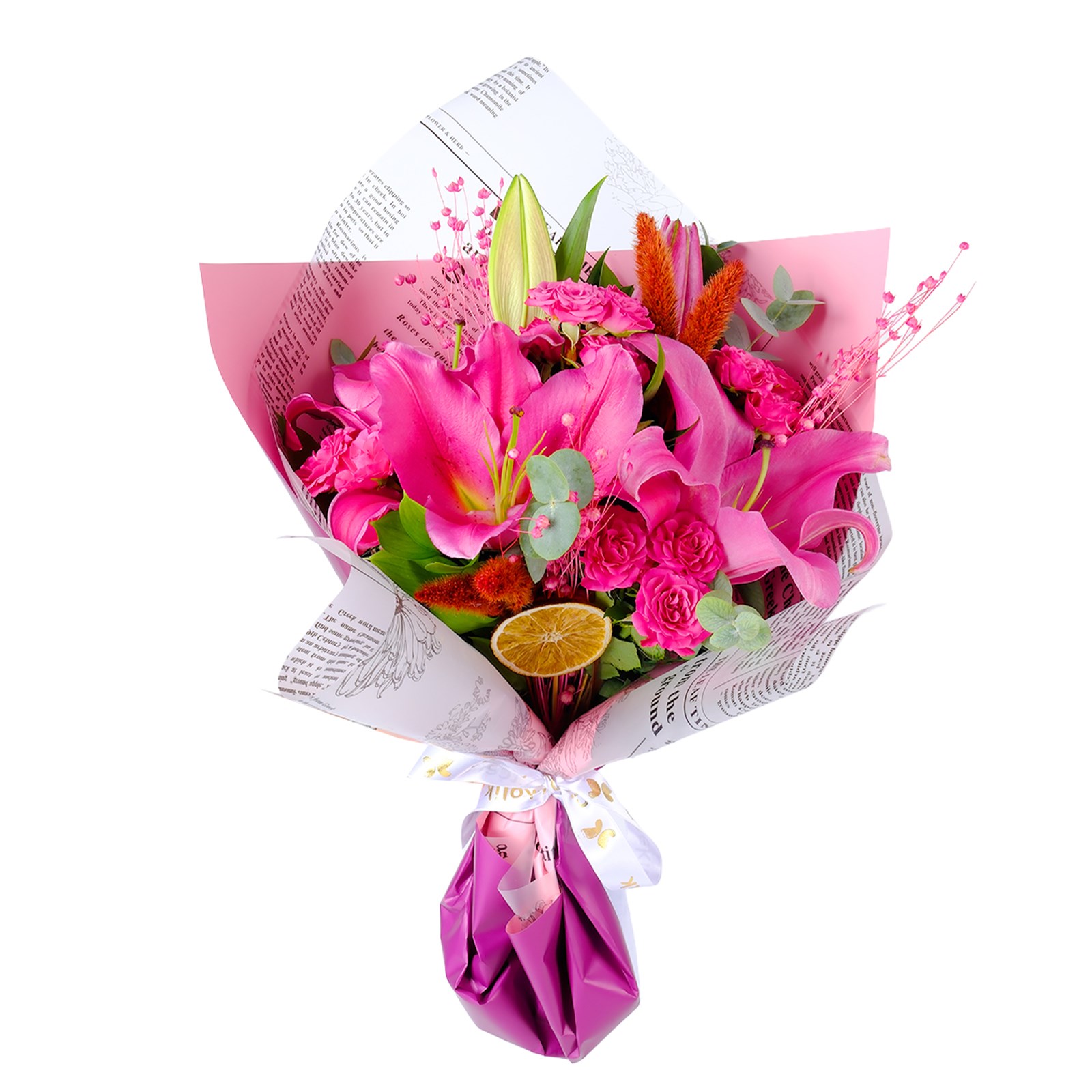 Fenimen, zarif ve etkileyici: Pembe Zambak Buketi sevgi dolu bir jestin en zarif hali. Şık pembe zambaklar, pembe çardak güller ve kuru çiçekler ile harmanlanarak romantik bir atmosfer yaratır. Anlamlı bir hediye arayanlar için harika tercih.