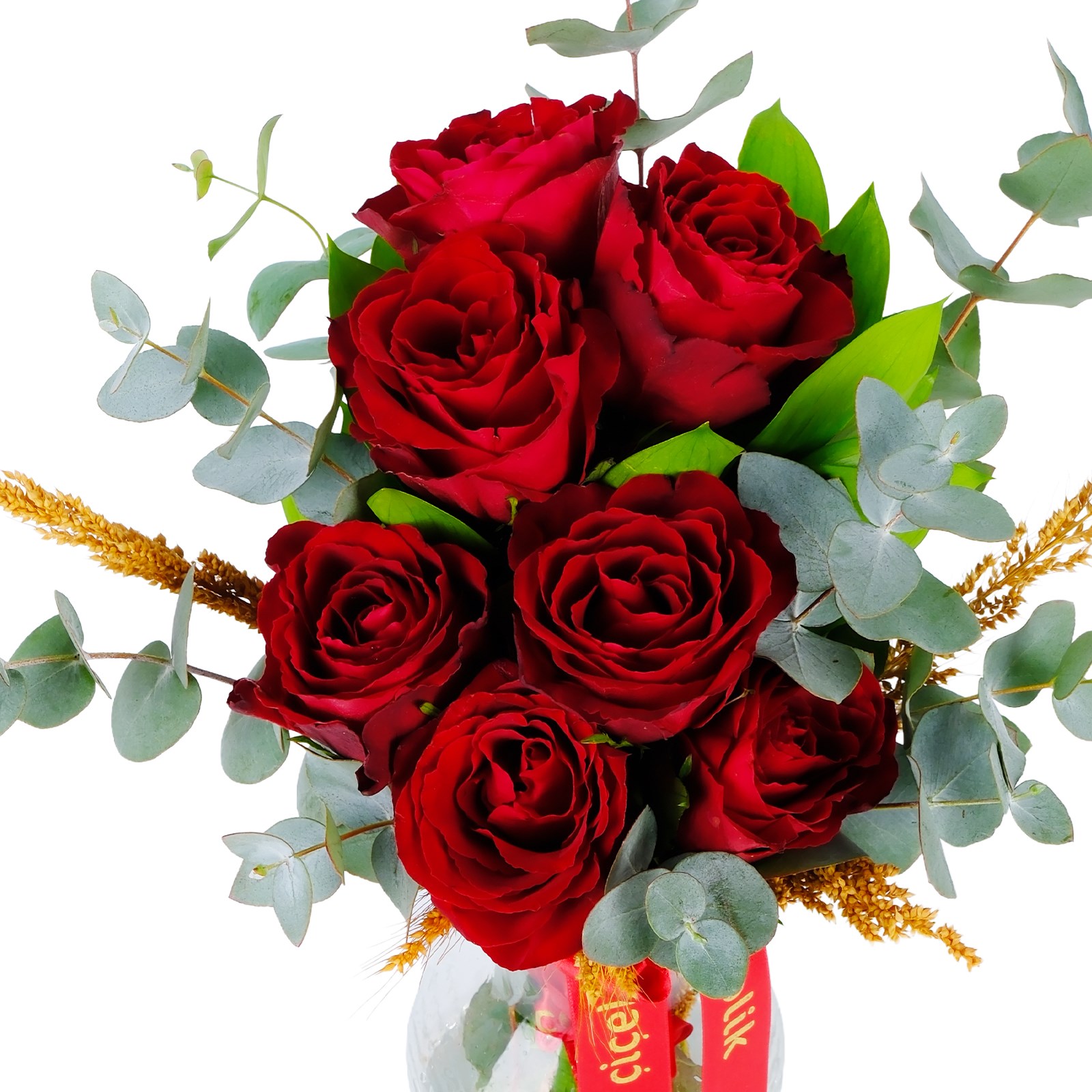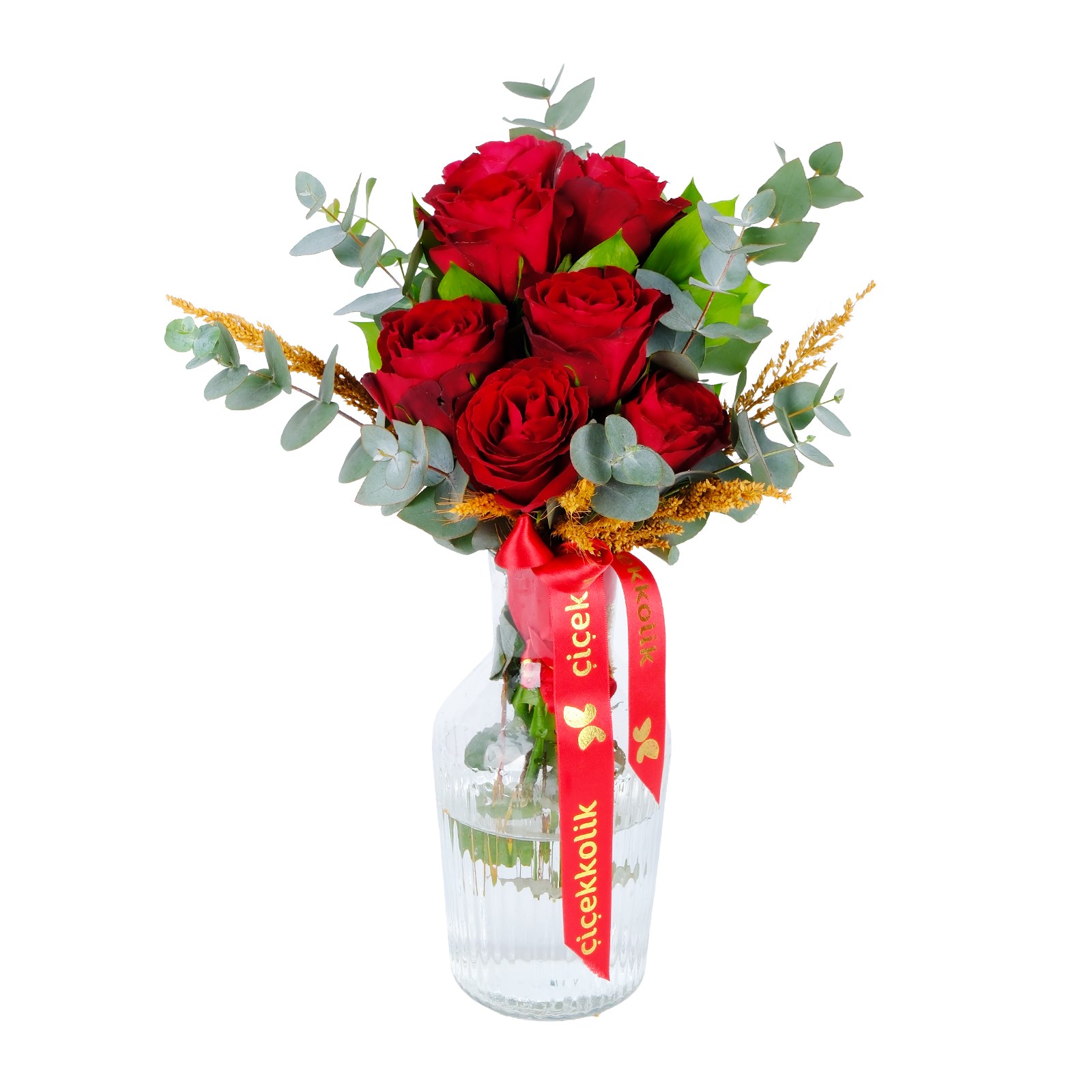 Kırmızı güllerin romantizmi The Classic Red Roses, aşkın en tutkulu halini yansıtıyor. Modern tasarım sofistike kontrastı, çarpıcı bir görsel sunarken okaliptus yaprakları kuru çiçekleriyle eşsiz bir dokunuş kazanılmıştır.