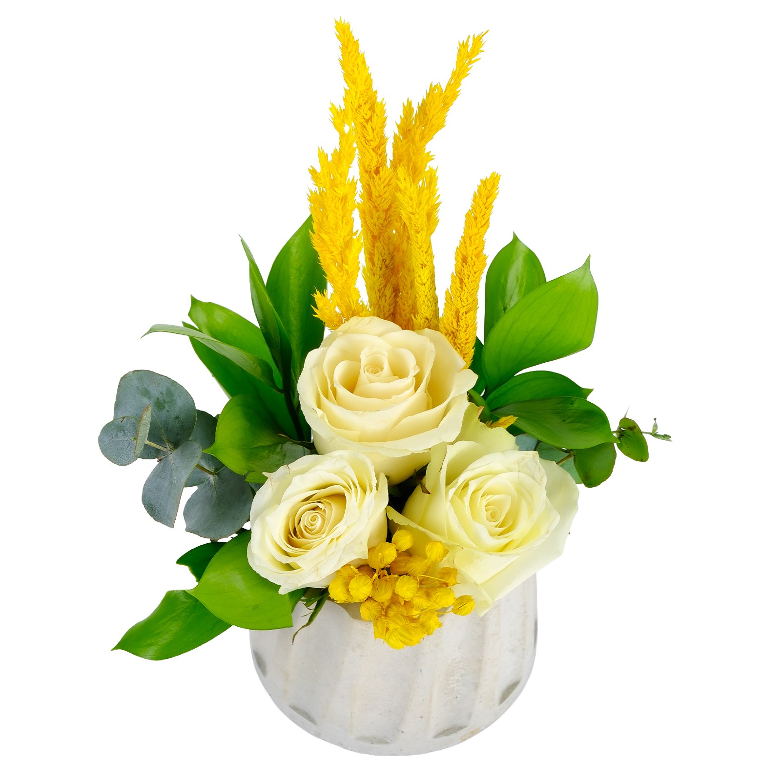 Romantik Beyaz güllerin narinliği ve masumiyeti bu aranjmanda iç ısıtan bir uyumla birleşiyor. Kuru çiçekler ve okalitus detayları tasarıma modern ve sıcak bir hava katıyor. Neşeyi ve sevgiyi zarif bir şekilde ifade etmek için harika bir seçimdir.