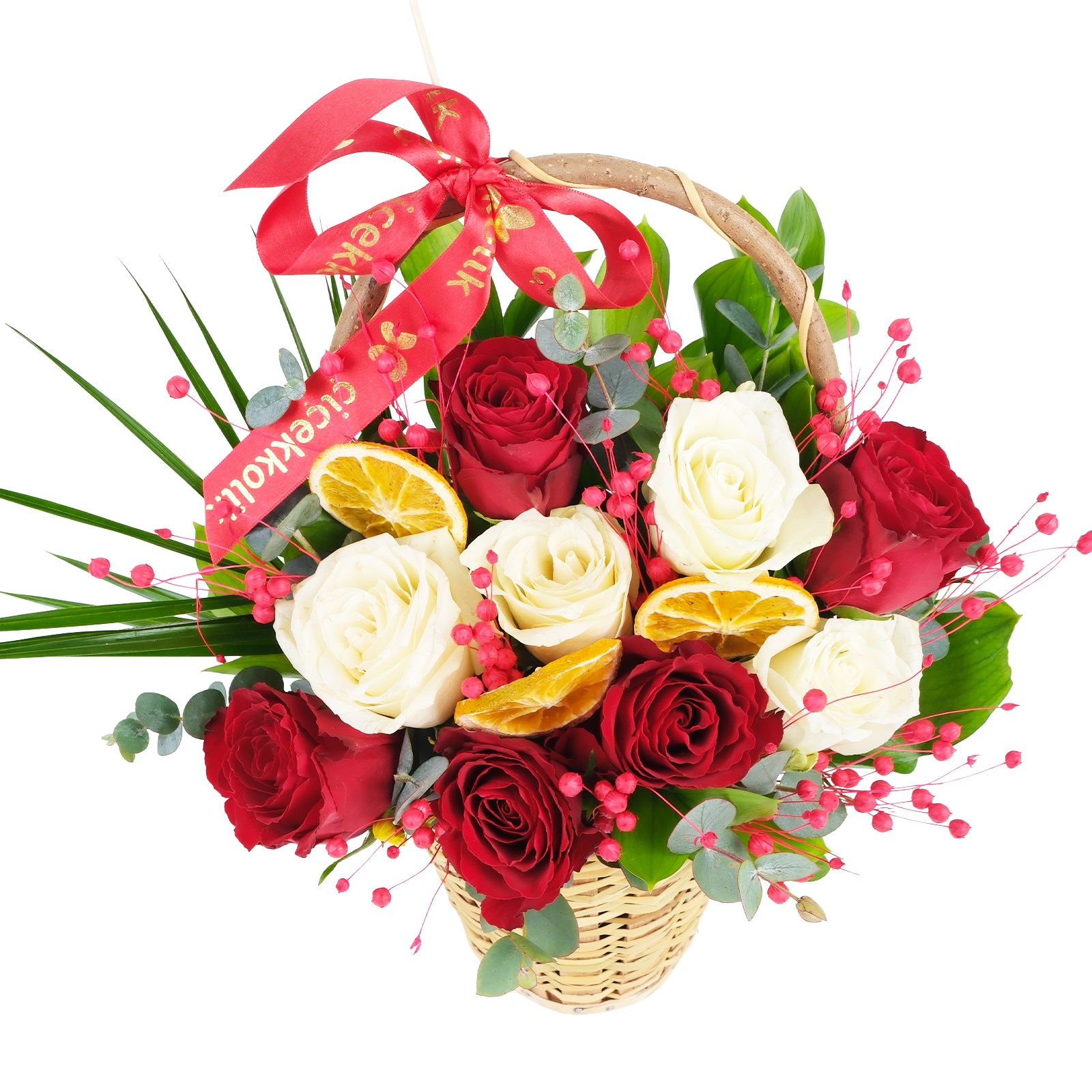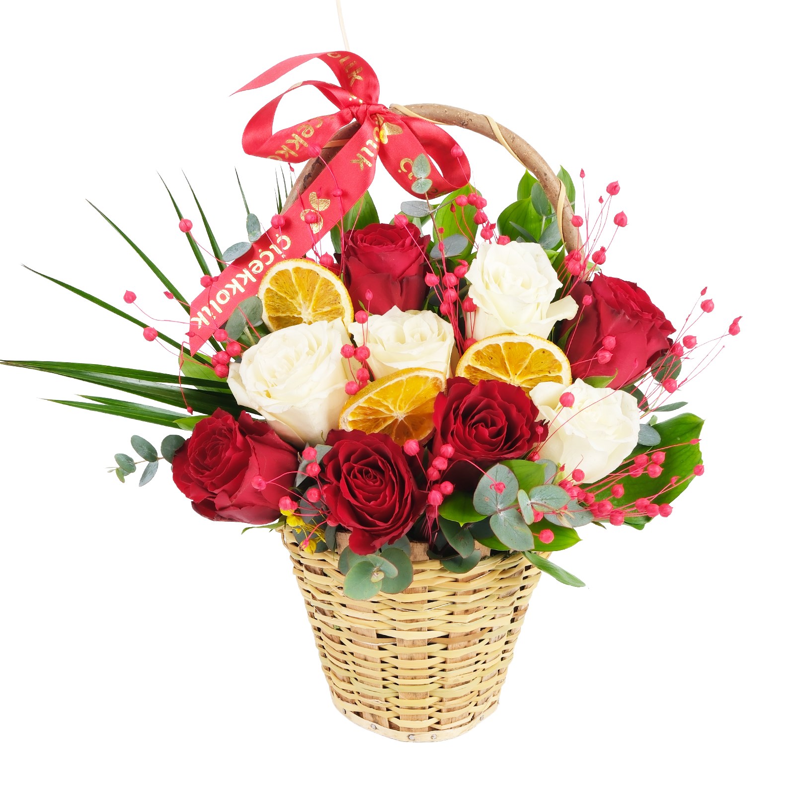 Çiçek Türü:Sepette Kırmızı Gül, Beyaz Gül ve portakal halkaları
