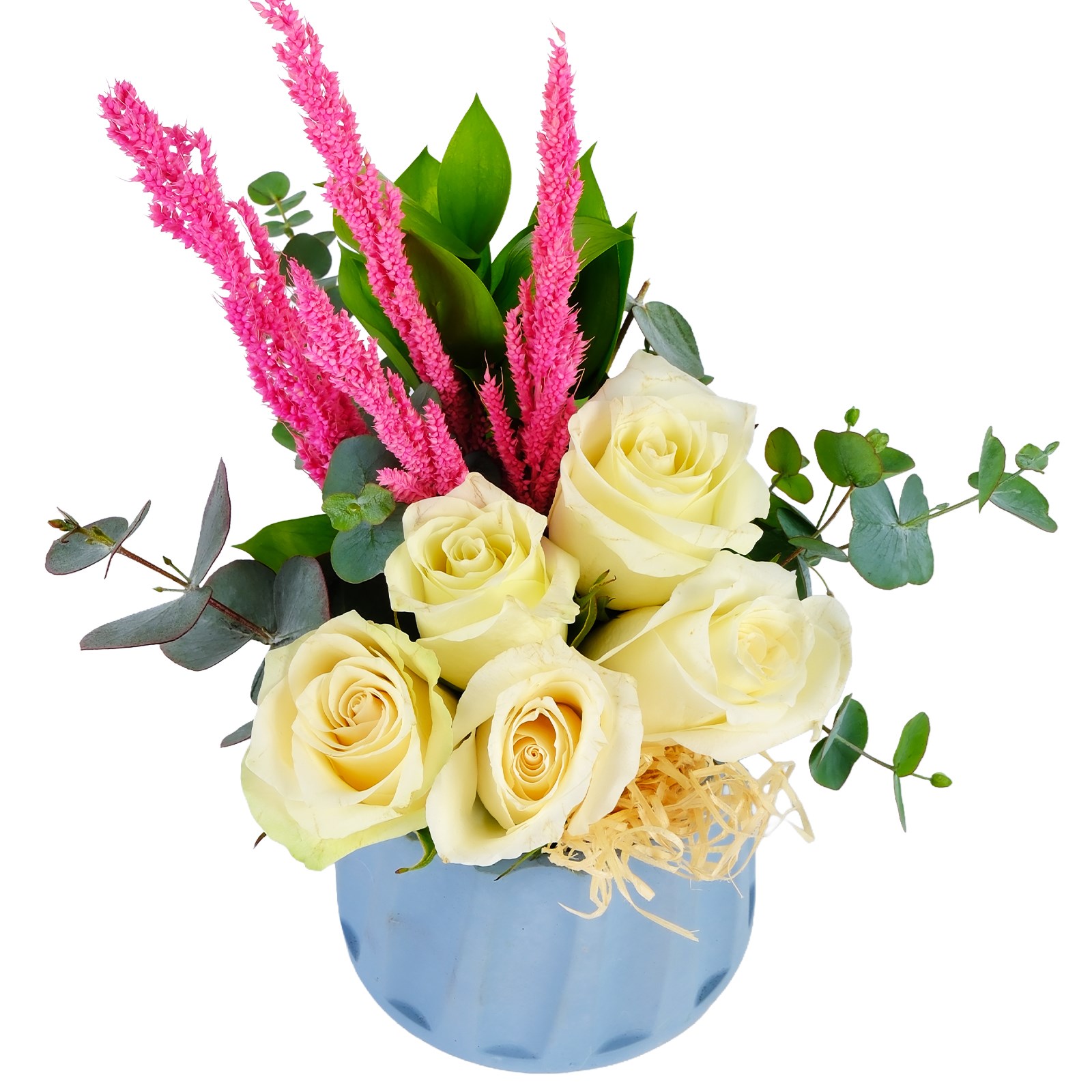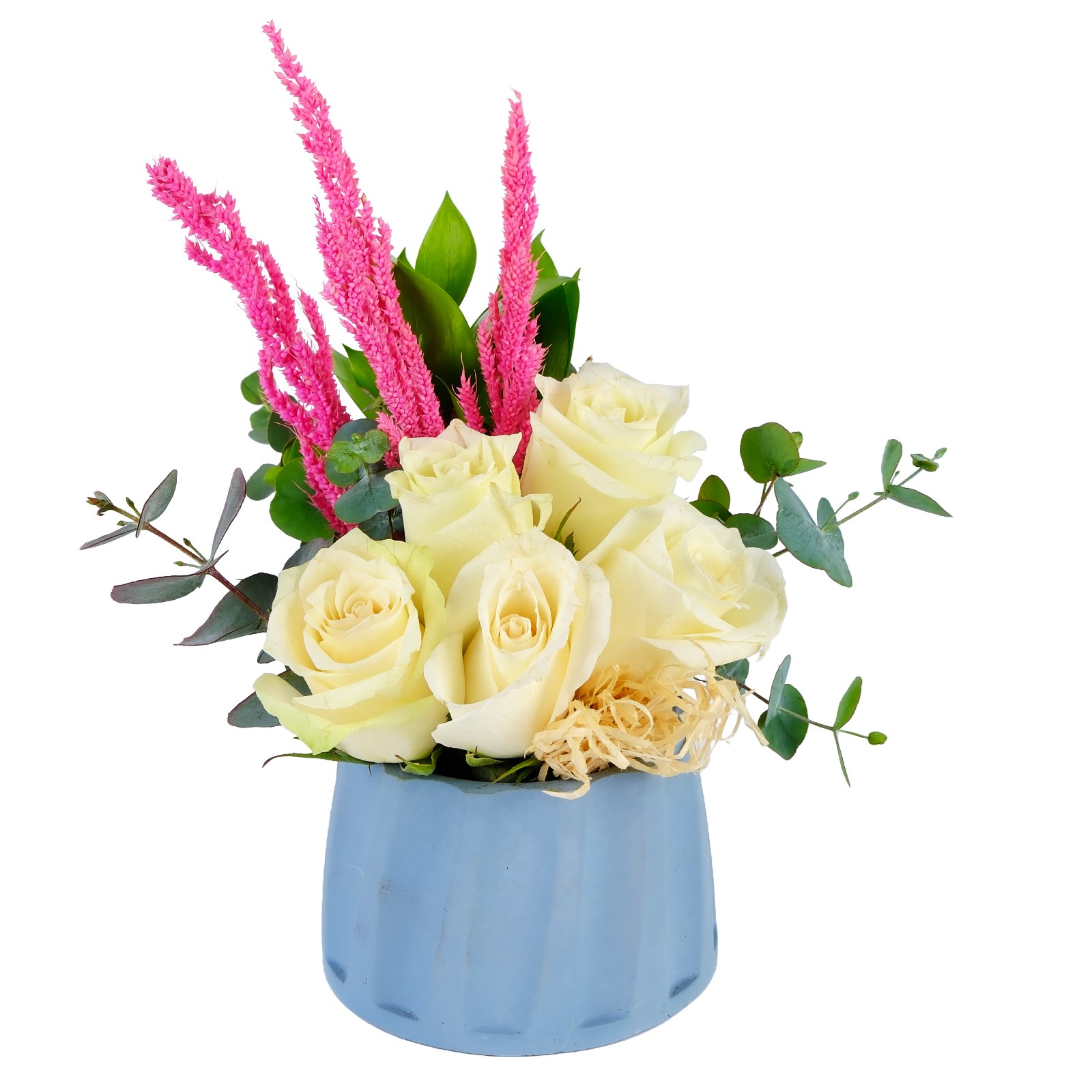 Romantik Beyaz güllerin narinliği ve masumiyeti bu aranjmanda iç ısıtan bir uyumla birleşiyor. Kuru çiçekler ve okalitus detayları tasarıma modern ve sıcak bir hava katıyor. Neşeyi ve sevgiyi zarif bir şekilde ifade etmek için harika bir seçimdir.