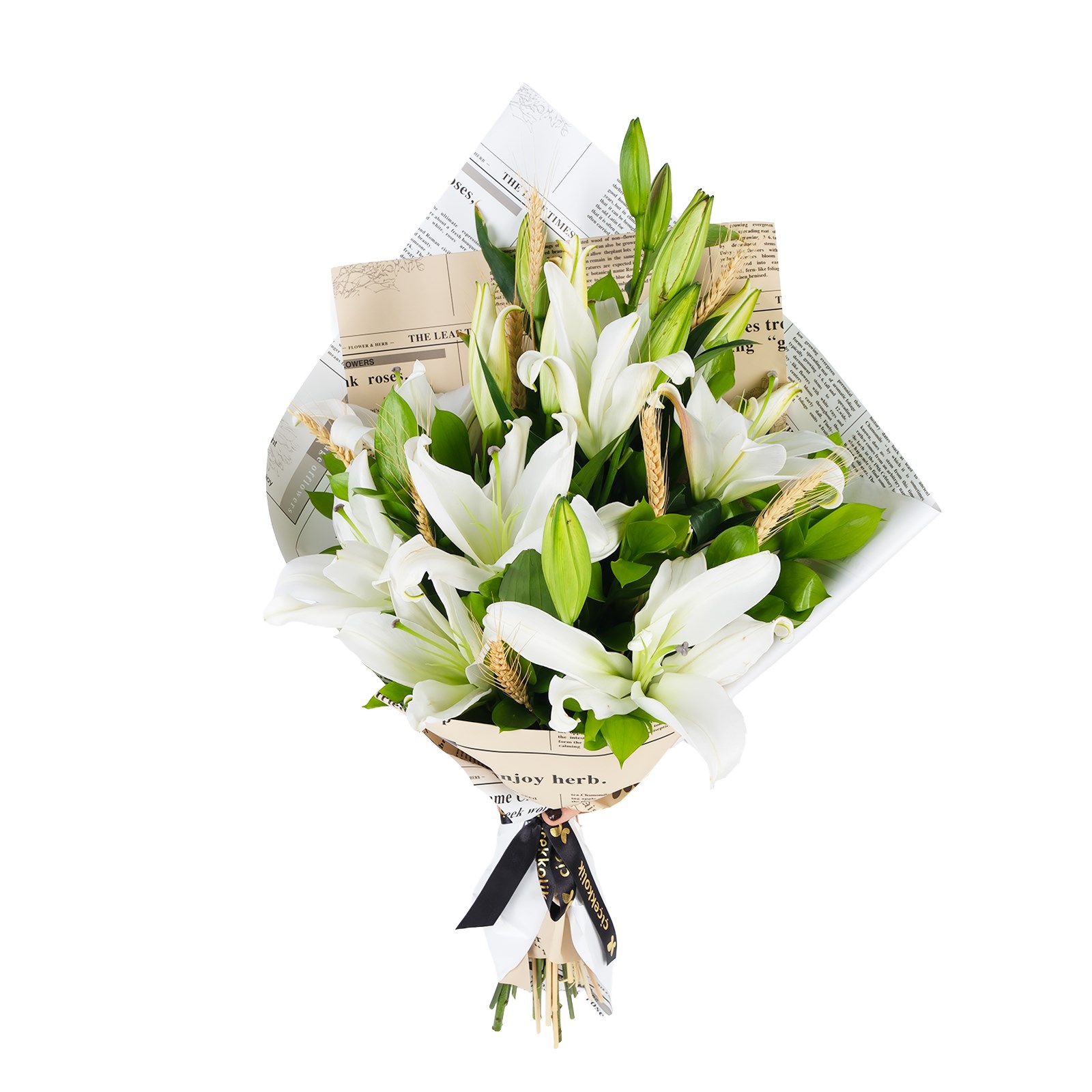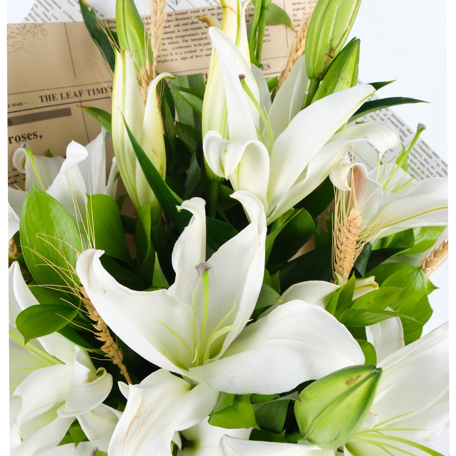 Zarafetin en etkileyici haliyle hazırlanmış White Lilyum Çiçek Buketi saflığını ve tazeliğini büyük bir aranjmanla sunar. Özel günler ve kutlamalar için etkileyici bir seçenektir.