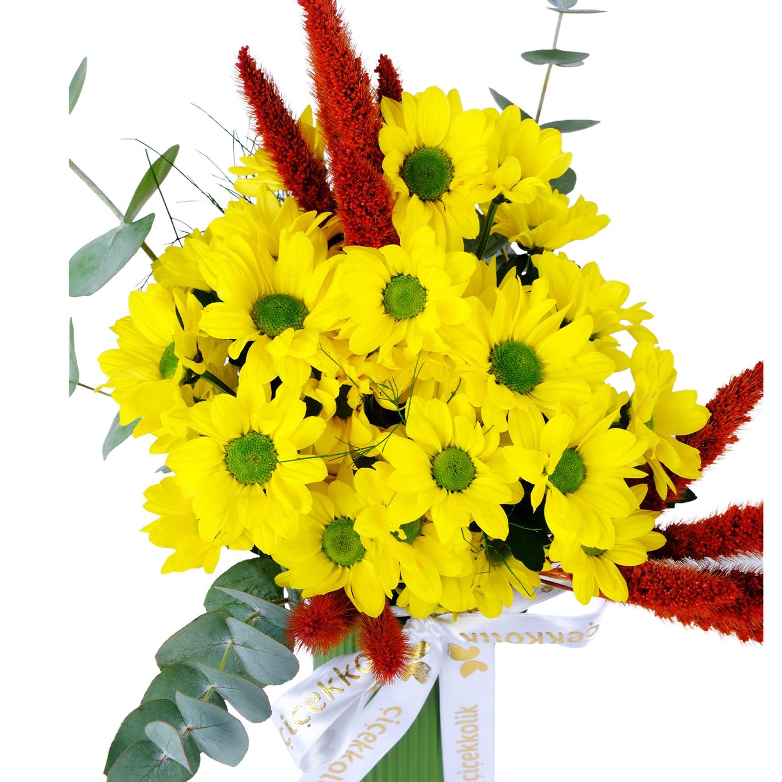Çiçek türleri:Sarı papatyalar, okaliptus yaprakları