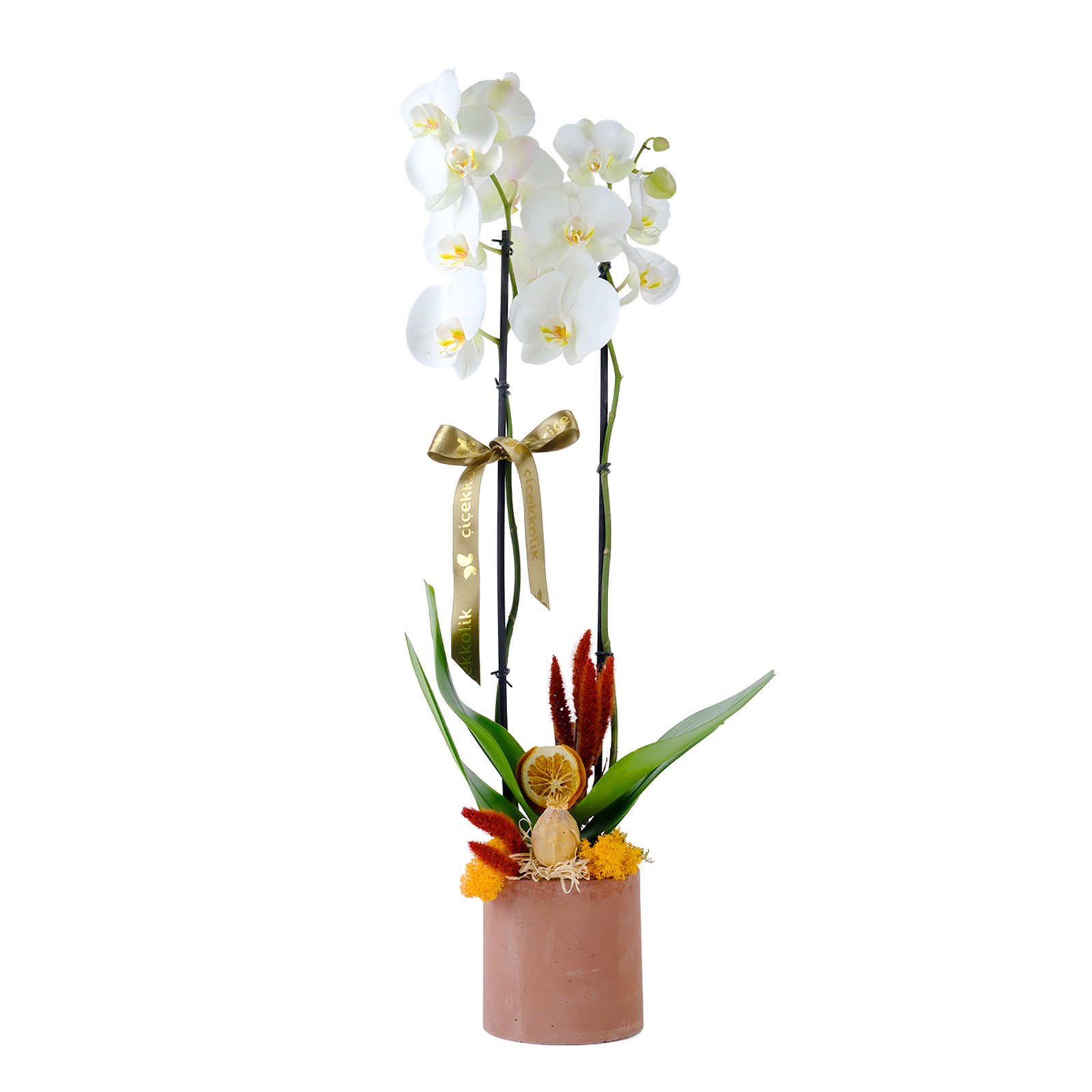 Zarif görünümü ve eşsiz rengiyle Çift Dallı Beyaz Orkide, yaşam alanlarına modern bir dokunuş kazandırır. Naturel Beton Saksısı ve Gold kurdele detayıyla hem sofistike hem de dikkat çekici bir tasarım sunar.