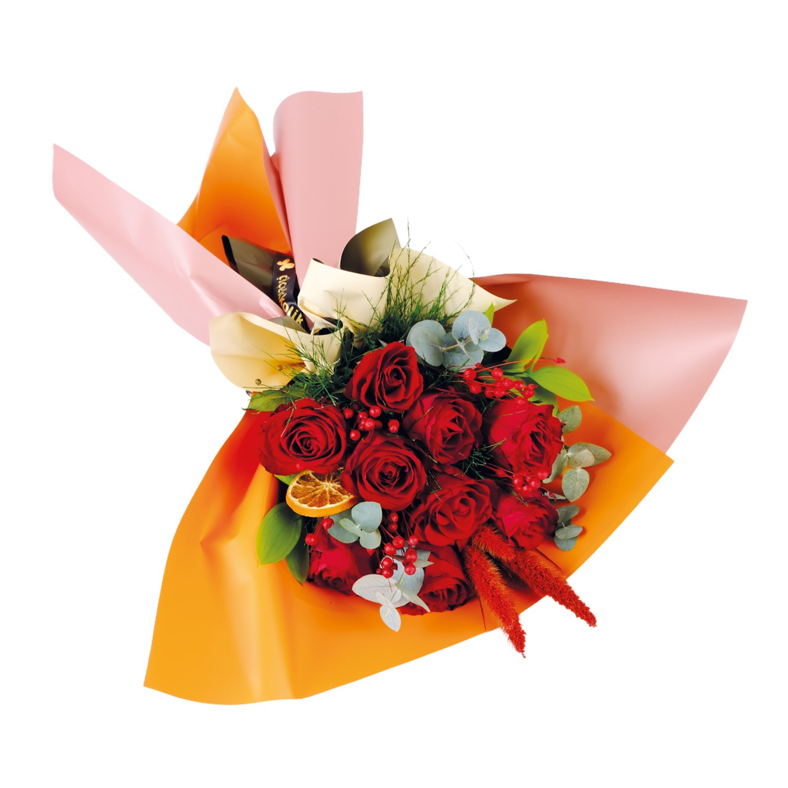 Derin kırmızı güllerin romantizmini, kuru çiçeklerin doğal zarafetini bir araya gertiren Zen Harmony 9 kırmızı gül buketi, aşkın en tutkulu halini yansıtıyor. Turuncu pembe tasarım ambalajın sofistike kontrastı, çarpıcı bir görsel sunarken okaliptus yaprakları ve kuru çiçekleriyle eşsiz bir dokunuş kazanılmıştır.