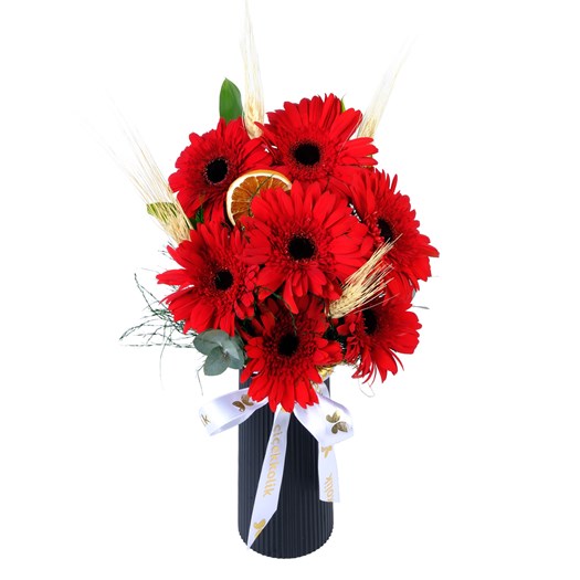 Gerbera çiçeği, Asteraceae ailesinin bir üyesi olan buzağı papatyası ailesine aittir. Gerbera bilimsel adı "Gerbera jamesonii" dir ve özellikle Afrika kökenlidir. Bu renkli çiçekler genellikle büyük ve göz alıcıdır. Gerberalar, beyaz, sarı, pembe, turuncu, kırmızı ve mor gibi birçok renkte bulunabilirler. Genellikle bu parlak renkleri nedeniyle bahçe süslemelerinde ve kesme çiçekler olarak kullanılırlar. Gerberaların kendine özgü bir yapısı vardır ve gösterişli merkezi diskleri ve zarif taç yaprakları ile tanınır.